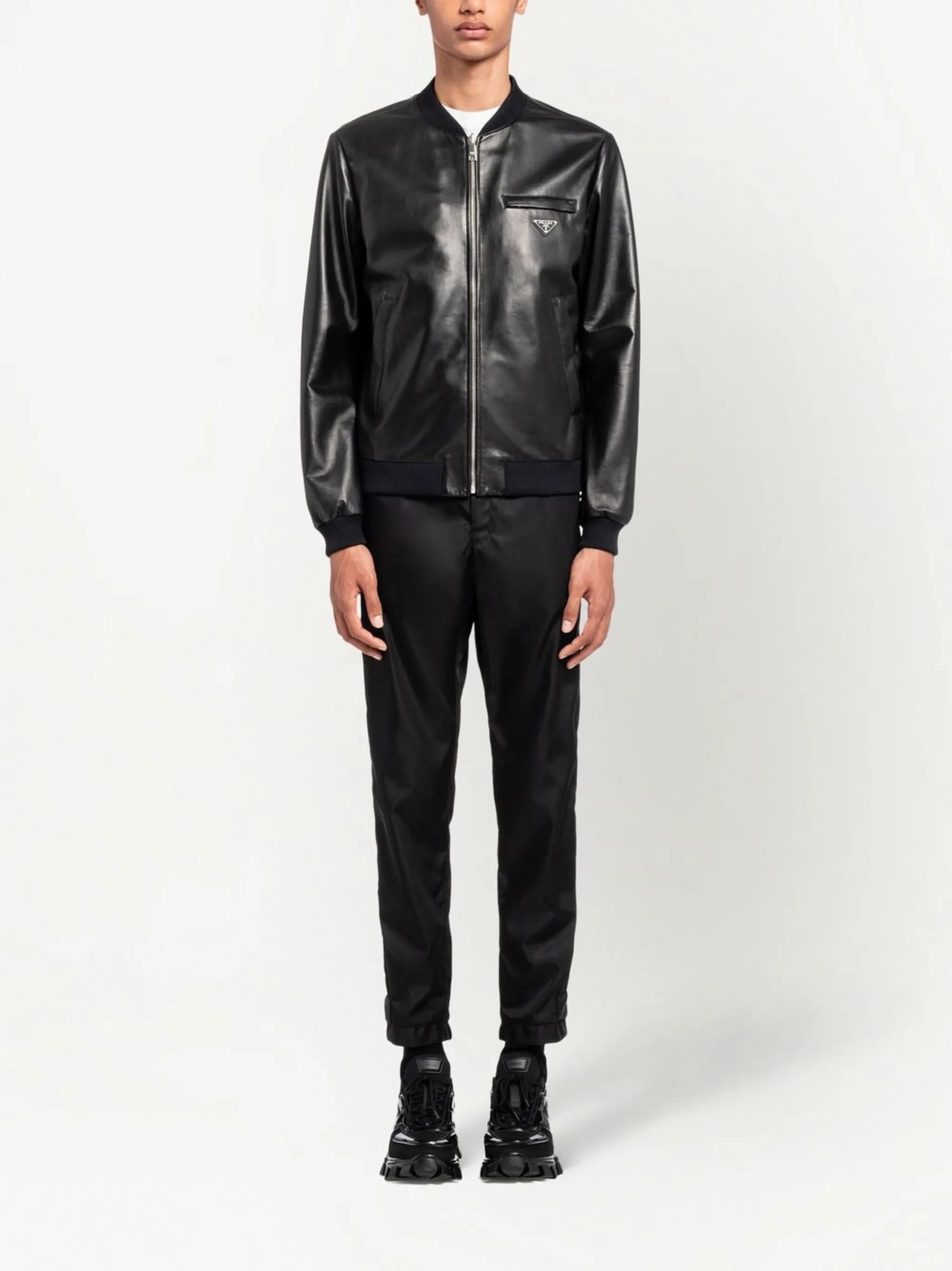 black leather front zip fastening baseball collar jetted chest pocket enamel triangle logo two side inset pockets long sleeves ribbed cuffs and hem - Color: BLACK - Made in: Italy - Designer Style ID: UPW280 S OOO 038 F0002 Composition and care Leather: 100.0%