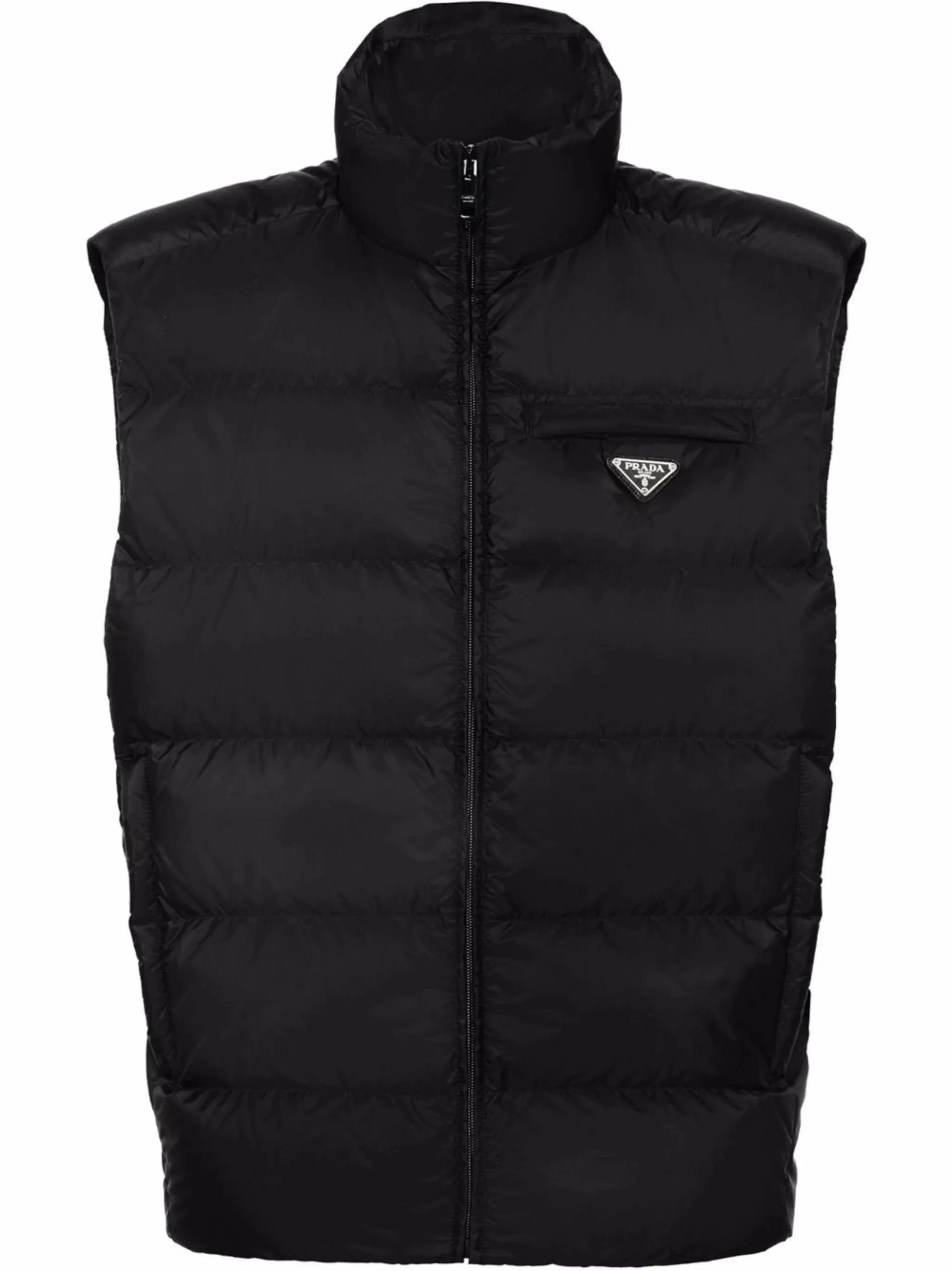 Black recycled nylon Re-Nylon quilted padded gilet from PRADA featuring enamel triangle logo, padded design, quilted, front zip fastening, high neck, sleeveless, zip-fastening chest pocket and two zip-fastening pockets. . - Color: BLACK - Made in: Italy - Designer Style ID: SGB033 S OOO 1WQ9 F0002 Composition and care Nylon: 100.0%