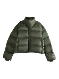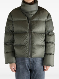 dark olive green quilted design asymmetric zip fastening high neck long sleeves - Color: GREEN - Made in: Italy - Designer Style ID: RU02E1797 NPD3 25 Composition and care Lining Composition Cotton: 97.0%, Outer Composition Wool: 100.0%, Lining Composition Goose Down: 90.0%, Outer Composition Recycled Nylon: 100.0%, Lining Composition Elastane: 3.0%