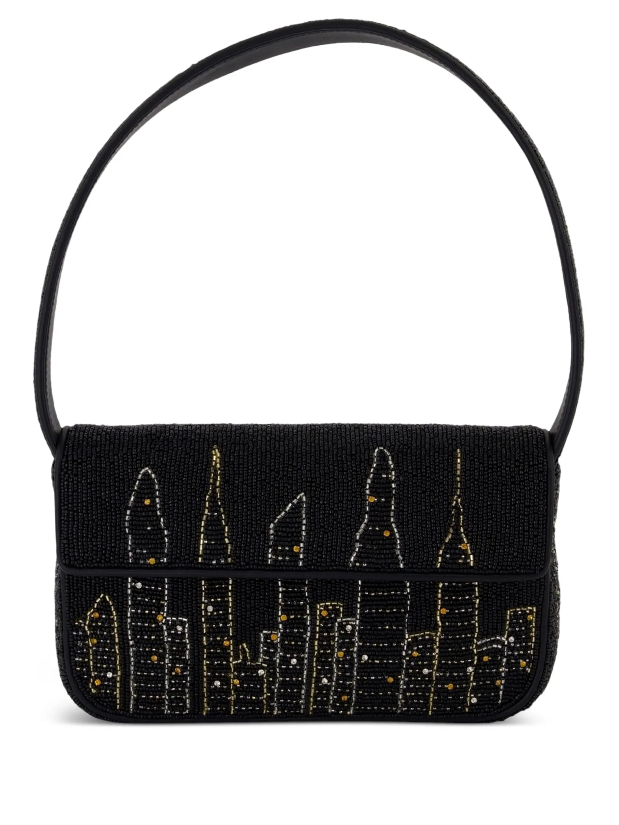 black glass bead embellishment skyline motif top handle flap closure rectangular shape - depth: 12.7 centimetres, height: 14.986 centimetres, width: 24.892 centimetres - Color: BLACK - Made in: India - Designer Style ID: H25R6001PB NYSK Composition and care Polyurethane: 100.0%, Rayon: 100.0%, Glass: 100.0%