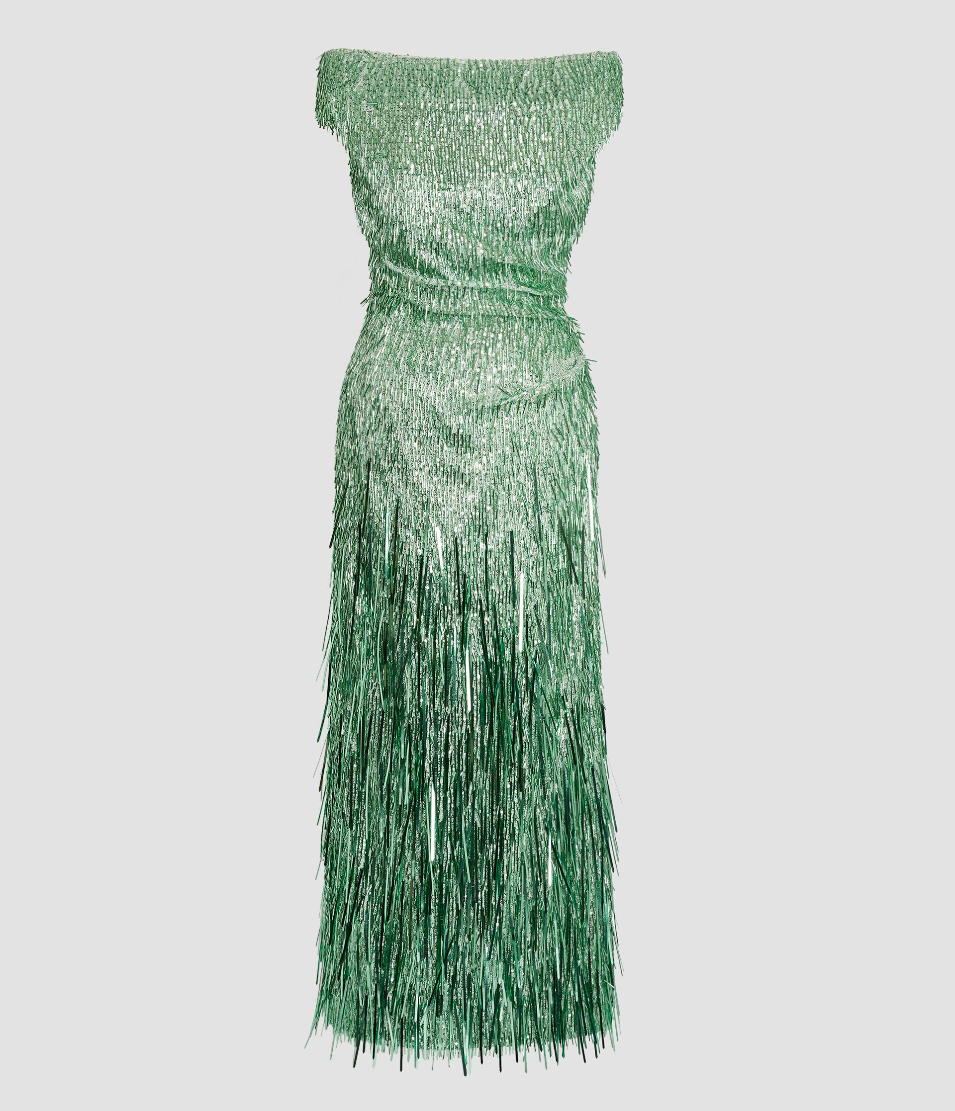 This cocktail dress is covered in spearmint sequins. The slim silhouette falls to an ankle-length hem. - Slim silhouette - Fully lined - Ankle length - Off the shoulder - Cap sleeves - Centre back vent - Centre back hook, eye, and concealed zip fastenings - Product code: AW25_D152_50653009 The dress will feature a refined finish and will not include the long sequins at the base (or hemline), as originally depicted. Fits true to size. Fabric and Care 95% Polyester, 5% Spandex. Lining: 73% Acetate, 27% Silk. Dry clean.