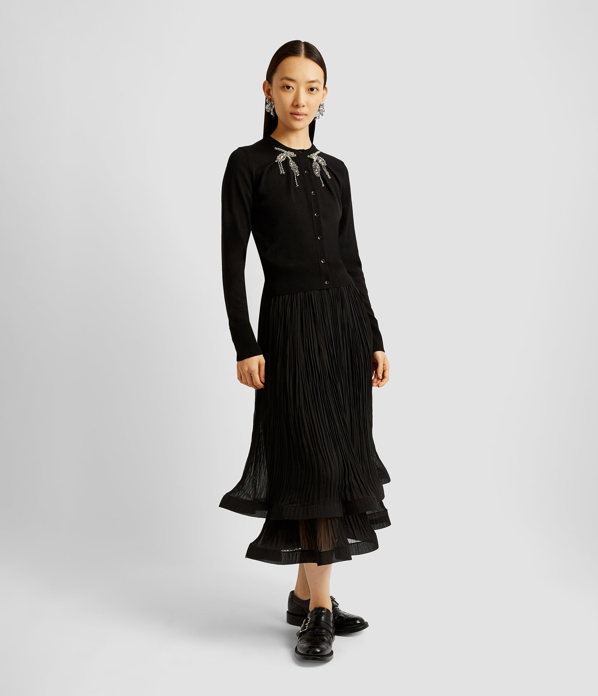 This black cardigan is finely knitted from pure merino wool and shaped for a close, cropped fit. It has flattering folds at the crew neckline and is embellished with jewellery-like patches inspired by 1920s tasselled flapper dresses. Each patch is hand-embroidered using silver faceted glass beads and shimmering crystal stones. Size and Fit This cropped cardigan has a crew neckline, long sleeves, and button fastenings through the centre front. Fits true to size. Fabric and Care Fabric1: 100% Merino Wool. Embroidery: 70% Glass, 20% Brass, 5% Metal, 5% Polyester. Dry Clean.