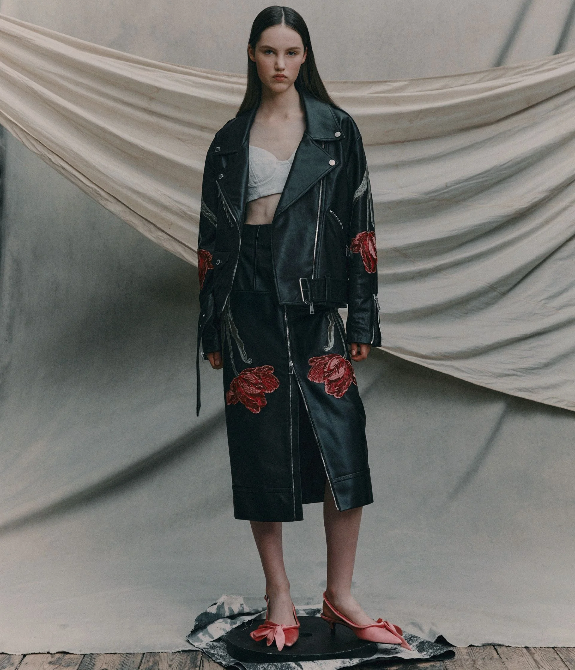 Look 21: Motorcycle jacket in black calfskin with tulip embroidery worn with pencil skirt in black calfskin with tulip embroidery. Worn with ivory satin bra top.For Pre Spring 2026, Erdem has delved into the work of Maria Sibylla Merian, the 17th Century German entomologist and botanical illustrator. Her illustrations are woven into designs that balance structure with looseness, where romantic detailing meets modern sensibility. Slim fitted. Fits true to size. Fabric and Care Dry clean.