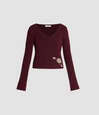 Knitted for a slim silhouette, this burgundy, cropped sweater has a V-neck and long sleeves. It is decorated with crystal embroidery depicting flowers. - Fitted silhouette - Lightweight knit - V-neck - Long sleeves with split cuffs - Crystal embroidery - Product code: PF25_KT17_30015002 Fits true to size. Fabric and Care 59% Polyester, 23% Viscose, 10% Wool Merino, 5% Cashmere, 3% Elastane. Embroidery: 40% Brass, 40% Glass, 20% Nylon.