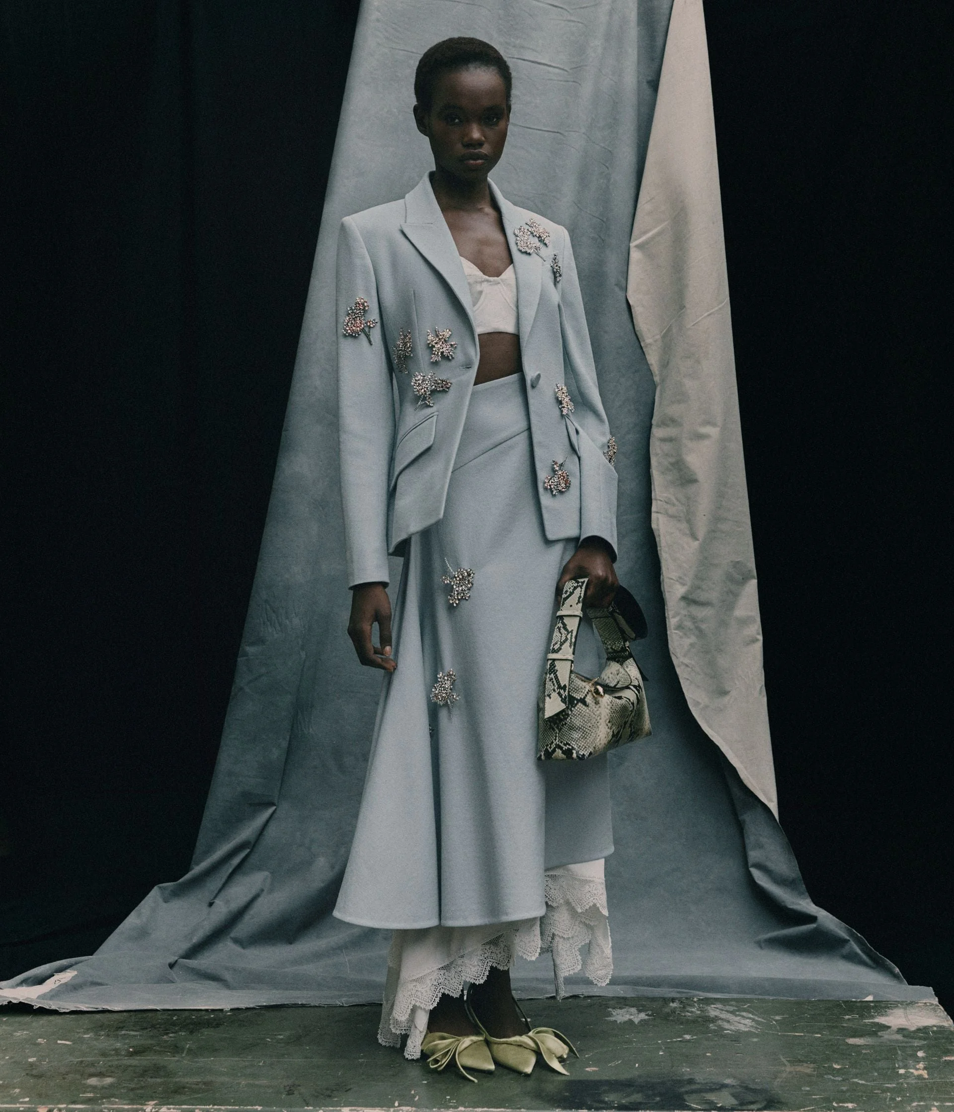 Cut from porcelain blue wool crepe, this structured blazer is shaped for a classic fit. It is embellished with colourful crystal flower brooches inspired by 18th century botanical illustrations. - Classic fit - Lapel collar - Centre front button fastening - Long sleeves - Flap-front welt pockets - Centre back vent - Fully lined - Product code: PS26_J26_70194016A Fits true to size. Fabric and Care 100% Wool. Lining: 100% Silk. Embroidery: 100% Metal Trim:100% Brass. Dry clean.