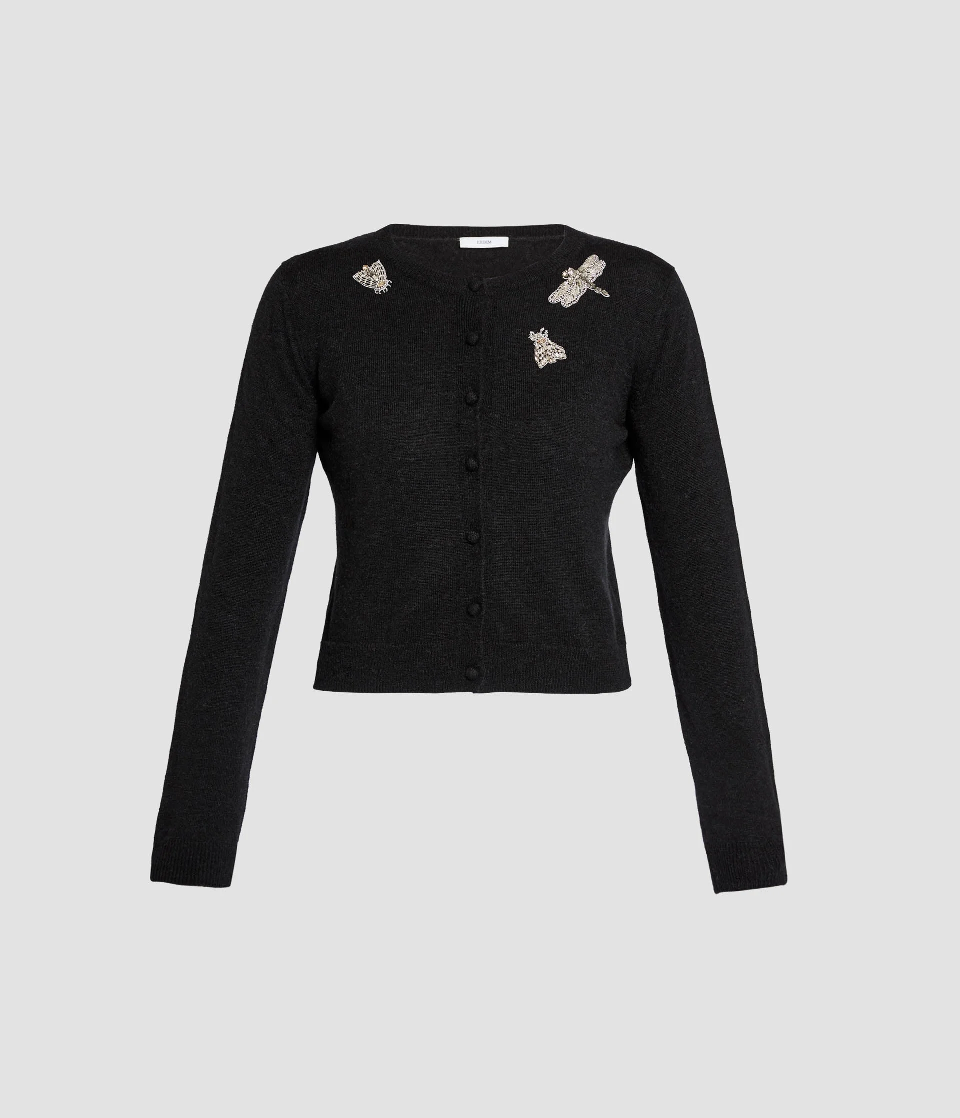 Knitted for a close fit, this black cardigan is made from a blend of alpaca and wool. Crystal embroidery depicts delicate insects, a nod to the season’s muse, Maria Sibylla. - Classic fit - Lightweight knit - Crew neck - Centre front button fastenings - Long sleeves - Ribbed cuffs and hem - Cuffs and hem - Product code: PS26_KT42_30201000 Fits true to size. Fabric and Care 41% Polyamide, 20%Wool, 30% Lyocel, 15% Alpaca. Dry clean.