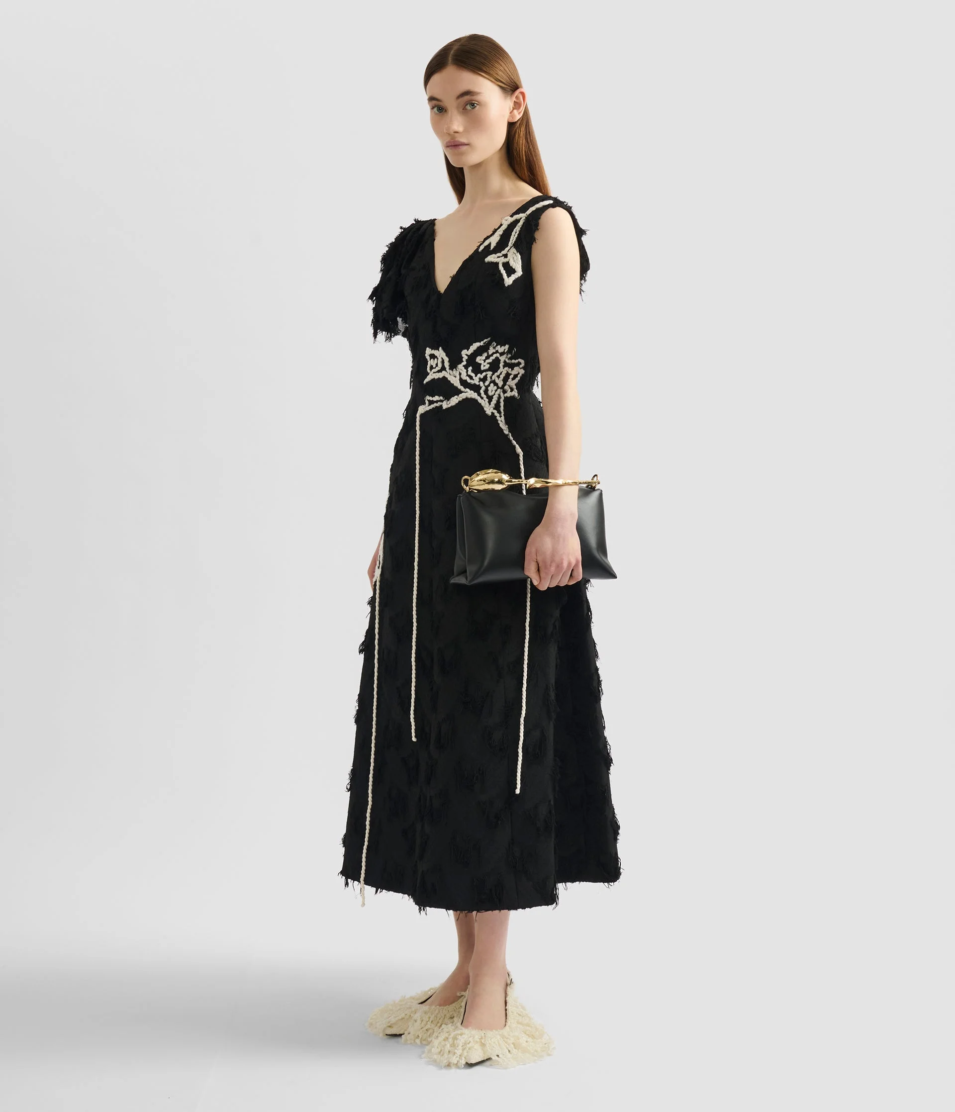 This black dress features a hand-draped V-neck bodice and is made from fil coupe paisley jacquard. It is decorated with vignette threadwork applique inspired by the artist Kaye Donachie. - A-line silhouette - Fully lined - Ankle length - Deep V-neck - Sleeveless - Centre back hook, eye, and concealed zip fastenings - Hidden pockets - Product code: AW25_D188_50611000B Fits true to size. Fabric and Care 95% Viscose, 5% Polyamide. Lining: 100% Silk. Embossing: 45% Wool, 45% Acrylic, 10% Nylon. Dry clean.