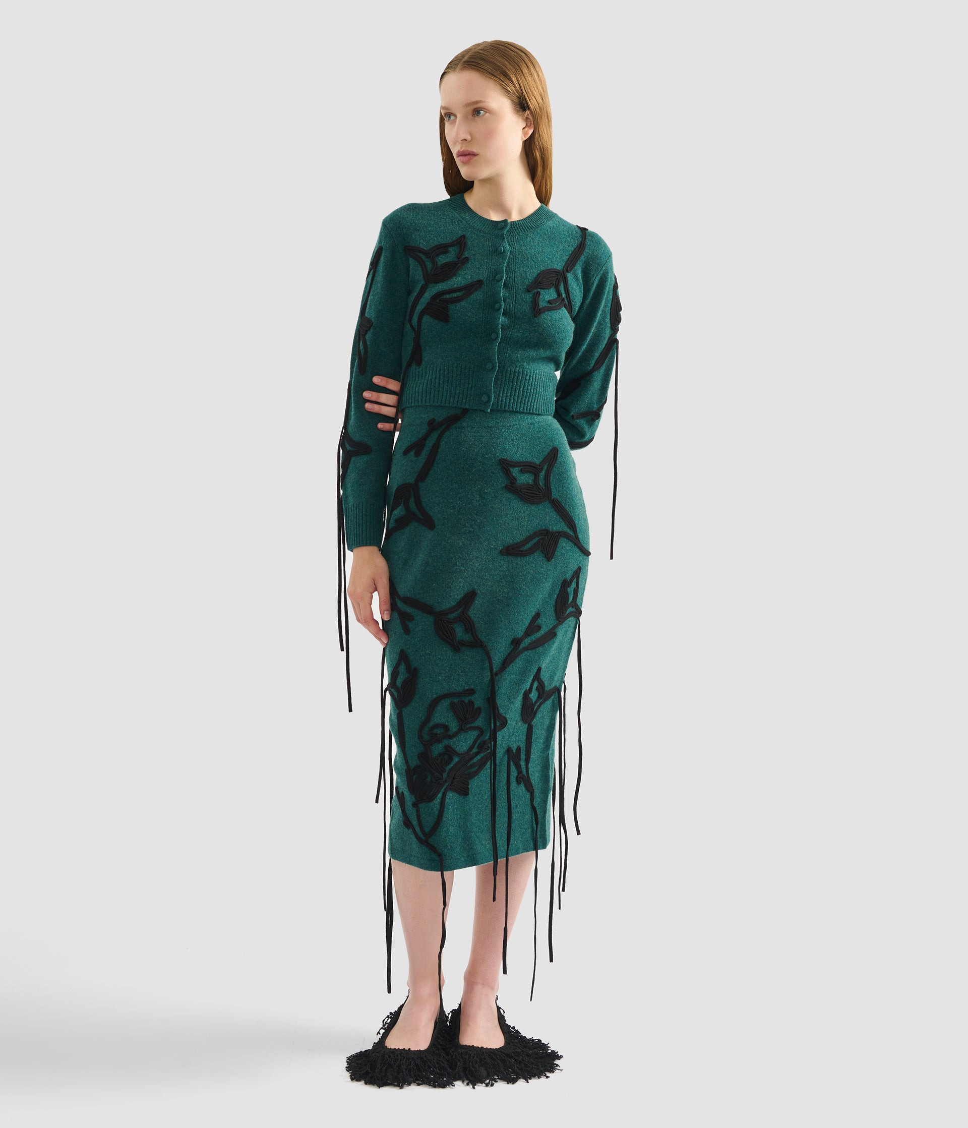 Knitted from green extra fine merino wool, this cardigan is embroidered with black flowers. - Cropped fit - Crew neck - Centre front button fastenings - Long sleeves - Ribbed cuffs and hem - Floral embroidery - Product code: AW25_KT28_30153007 Fits true to size. Fabric and Care 100% Extrafine Merino Wool. Dry Clean.