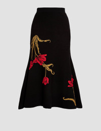 This mid-weight knitted skirt is fitted through the hips and flares to an A-line hem. It is woven with red jacquard tulips. - Fluted silhouette - Midi length - Slips on - Product code: PS26_KS8_30051000 Fits true to size. Fabric and Care 70% Viscose, 30% Polyester. Dry clean.