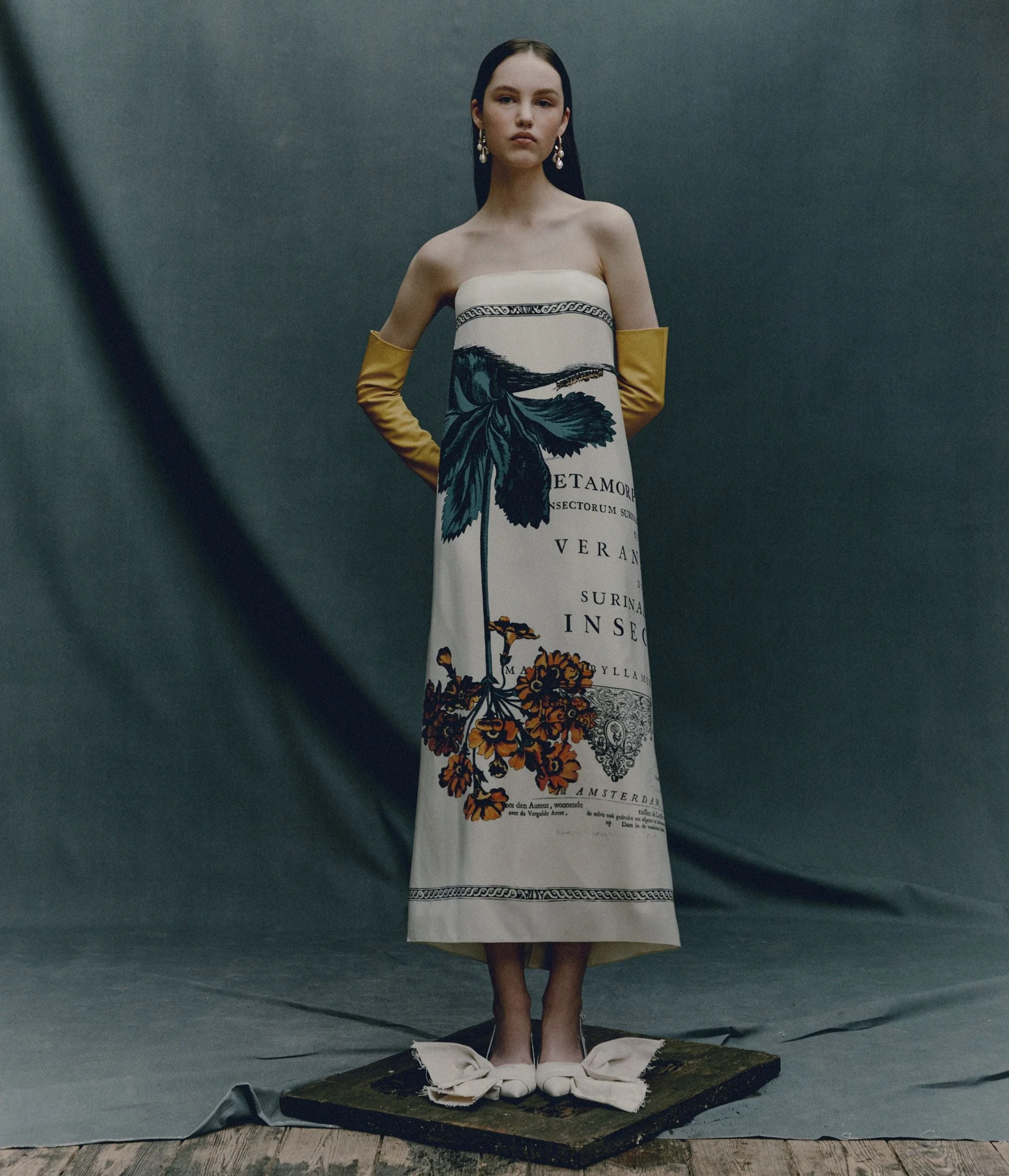 Cut from midweight duchess, this structured dress has an internal corset and a straight fit. The fabric is printed with an oversized floral etching inspired by traditional scientific drawings of flora and fauna. - Straight silhouette - Fully lined - Ankle length - Strapless - Centre back hook, eye, and concealed zip fastenings - Product code: PS26_D102_51438008 Slim fit at bodice. If in between sizes, recommend sizing up. Fabric and Care 100% Viscose (Fsc) Lining: 100% Silk. Dry clean.