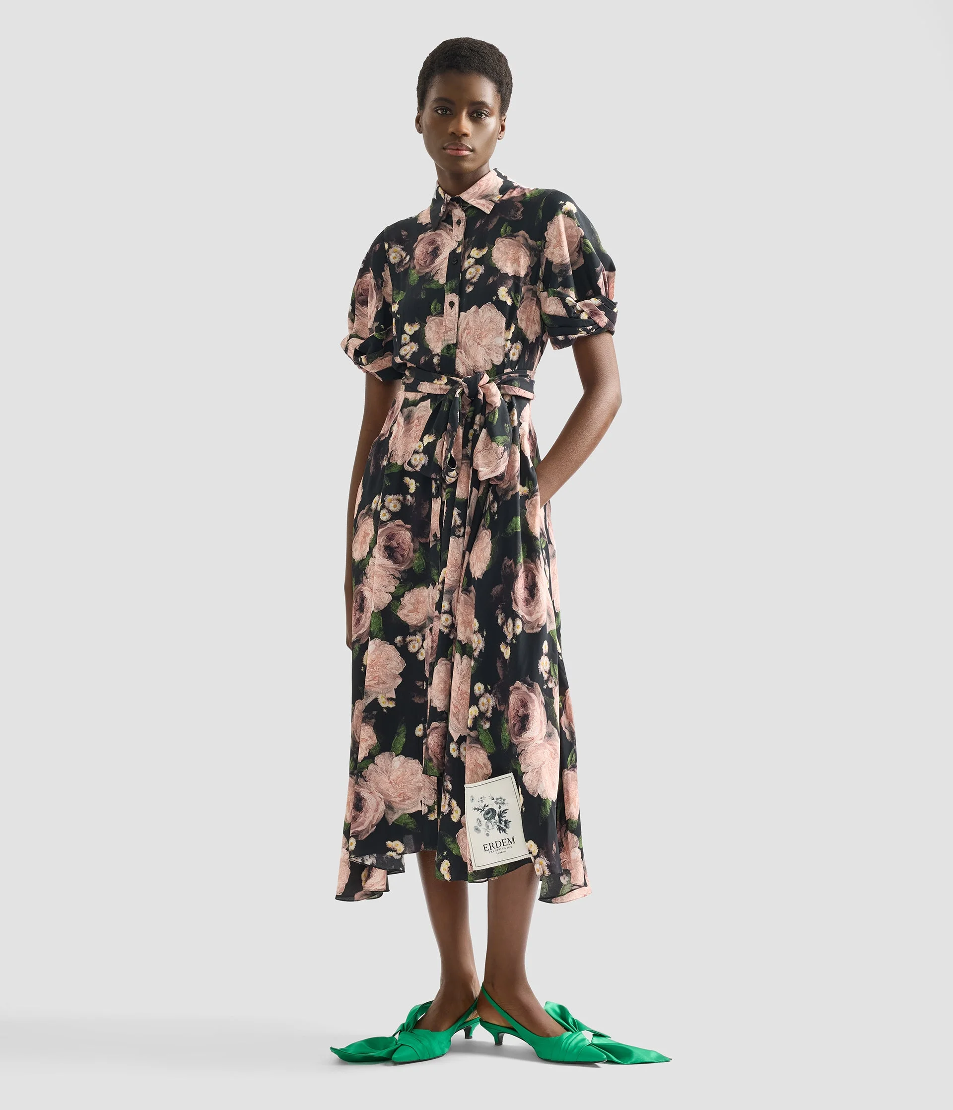 First seen in Pre-Spring 2019, this black crepe is decorated with painterly pink flowers and crafts a feminine shirt dress and is part of the 20th anniversary collection. Puff sleeves and a tie-fastening belt complete the look. A label at the hem marks the design as a piece from the capsule collection. - A-line silhouette - Lined at bodice - Midi length - Shirt collar - Short puff sleeves - Hidden side seam pockets - Centre front button-fastening placket - Label: ERDEM, Pre Spring 2019, Look 01 - Product code: 20Y_D209_51268009 Fits true to size. Model is 5'10½" (179.5cm) and wears a UK size 8. Fabric and Care 100% Viscose. Lining: 100% Silk. Dry clean.