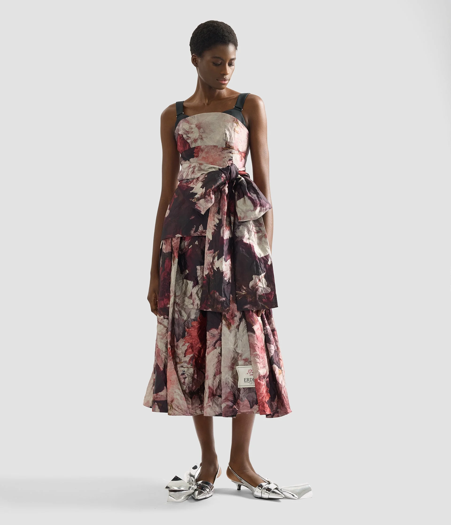 Crafted from crushed satin, this pink and burgundy dress is printed with a balletic floral in homage to the dancer Margot Fonteyn. Part of ERDEM’s 20th anniversary collection, it features a layered bustier neckline, drop waist, and gathered skirt. A unique label at the sleeve marks the design as a piece from the capsule collection. - A-line silhouette - Fully lined - Midi length - Bustier neckline - Shoulder straps - Tie-fastening belt - Centre back hook, eye, and concealed zip fastenings. - Label: Autumn Winter 2021, Look 15 - Product code: 20Y_D122_51175011 Fits true to size. Model is 5'10½" (179.5cm) and wears a UK size 8. Fabric and Care Main: 94% Polyester, 6% Metal. Secondary: 100% Polyester. Lining: 100% Silk. Dry clean.