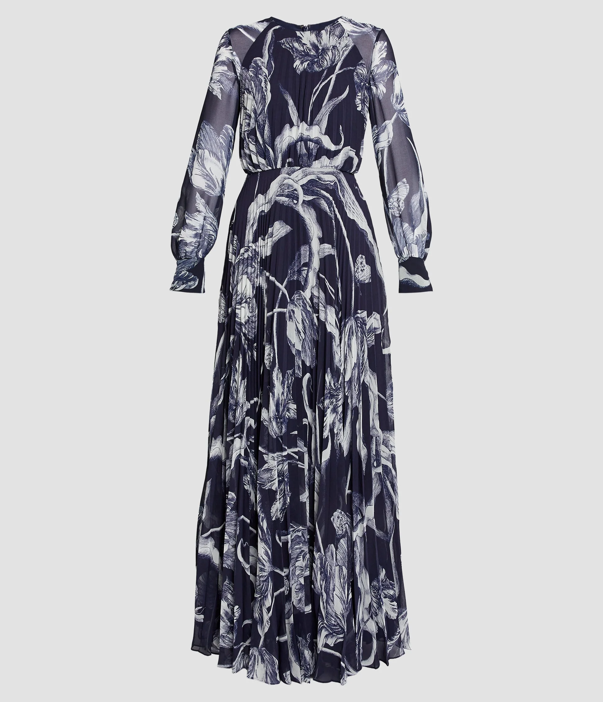 Cut from lightweight voile, this midnight gown is pleated through the bodice and skirt -the blouson sleeves are left unlined to show the fabric’s airy quality. It features an all-over botanical print inspired by traditional scientific illustrations. - A-line silhouette - Fully lined - Floor length - Crew neck - Long blouson sleeves - Centre back hook, eye, and concealed zip fastenings - Product code: PS26_G11_51104014 Fits true to size with a loose fit. Fabric and Care 100% Polyester. Lining: 100% Silk. Dry clean.