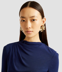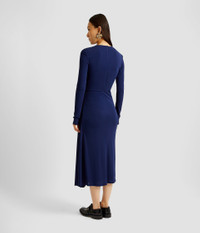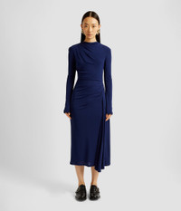 A versatile addition to your daywear rotation, this indigo dress is made from fluid crepe jersey. It is fitted through the bodice and skirt and features artful draping at the asymmetric neckline and hem. Size and Fit This mid-length dress has a high neckline and long sleeves. It is draped at the shoulder and hip. It has hook, eye, and invisible zip fastenings at the centre back, and is fully lined in navy jersey. Fits true to size. Fabric and Care 100% Viscose. Lining1: 74% Polyamide, 26% Elastane. Lining2: 73% Acetate, 27% Silk. Dry Clean.