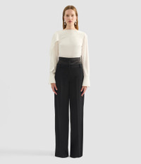 This matte ivory cady blouse has a contrasting satin drape which sits across the boat neck, shoulder and one of the sleeves. - Classic fit - Fully lined - Boat neck - Long sleeves - Centre back button fastenings - Shoulder drape - Product code: AW25_T40_50259002 Fits true to size. Model is 5'11½ (181cm) and wears a size UK 8. Fabric and Care 71% Acetate, 29% Viscose. Lining: 100% Silk. Dry clean.
