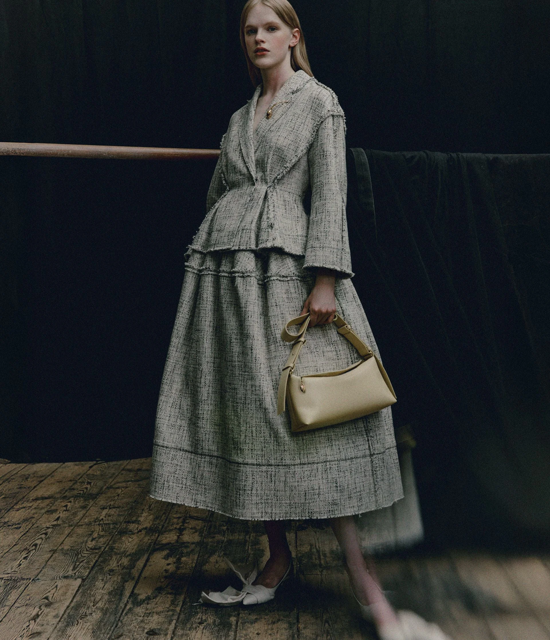 This voluminous skirt is made from alabaster and black tweed using mouline yarns to create the flecked finish. It has a raw hem with a zigzag topstitch. - Full silhouette - Fully lined - Ankle length - Raw hem - Centre back hook, eye, and concealed zip fastenings - Hidden side seam pockets - Product code: PS26_S36R_70189008 Fits true to size. Fabric and Care 96% Cotton Gots, 3% Polyamide, 1% Elastane. Lining: 73% Acetate, 27% Silk. Dry clean.