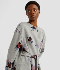 This grey coat is made from double-faced wool that is decorated with roses. It is shaped for a boxy fit and has a tie-fastening belt. - Boxy silhouette - Crew neck - Hook and eye fastening at centre front - Long sleeves - Patch pockets - Centre back vent - Unlined - Product code: PF25_C11_80051003 Fits oversized, recommend sizing down from your usual size. Fabric and Care 100% Wool. Embossing: 90% Silk, 10% Polyamide. Dry clean.
