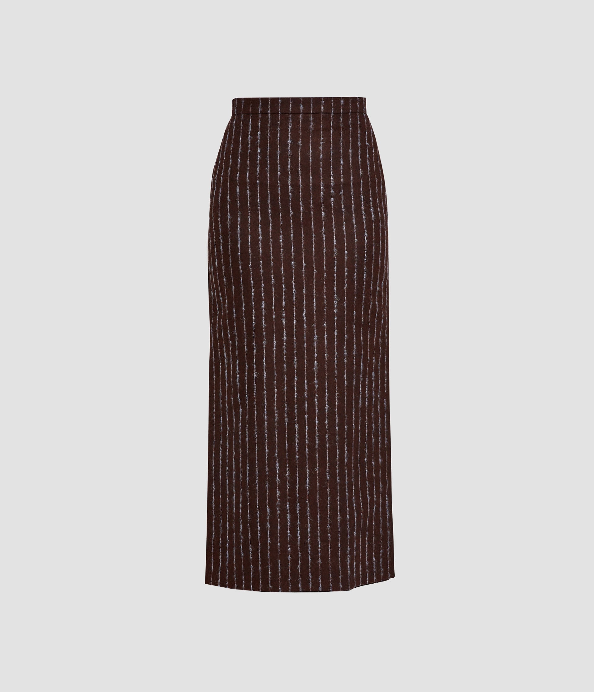 This pinstriped pencil skirt is cut from a wool-blend tailoring fabric in a dark plum hue. - Pencil silhouette - Fully lined - Midi length - Centre back hook, eye, and invisible zip fastenings - Product code: AW25_S24R_70076003 Fits true to size. Fabric and Care 93% Wool, 6% Mohair, 1% Polyamide. Lining: 100% Silk. Dry clean.
