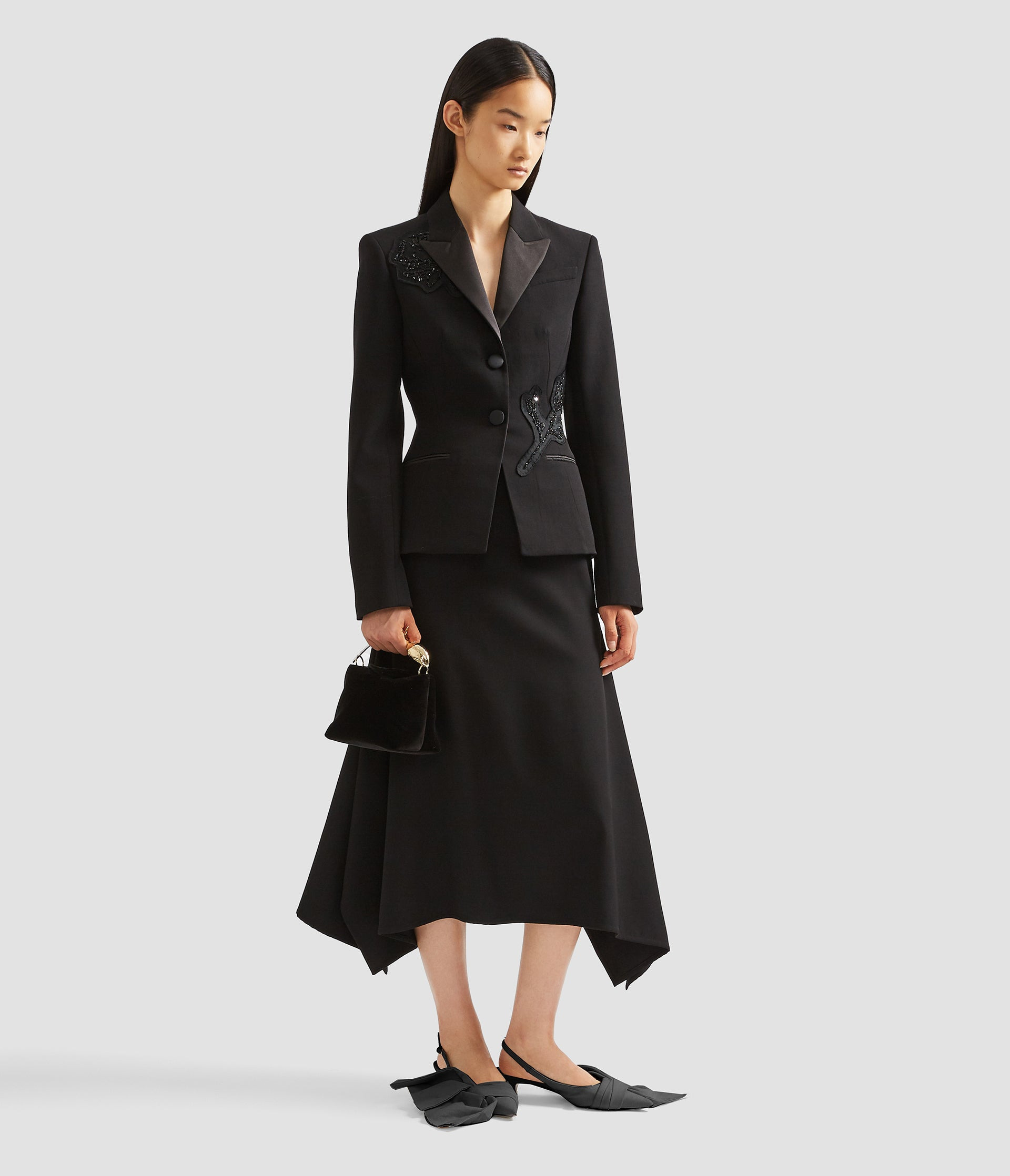 This black grain de poudre pencil skirt features side drapes to create an asymmetric hem. - Draped silhouette - Fully lined - Midi length - Centre back hook, eye, and concealed zip fastenings - Side drapes - Product code: PF25_S30_70031000 Fits true to size.Model is 5'10" (178cm) and wears a size UK 8. Fabric and Care 100% Virgin Wool. Lining: 100% Silk. Dry clean.