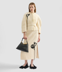 Cut from ivory boucle, this pencil skirt is embroidered with a black flower. - Pencil silhouette - Fully lined - Ankle length - Side splits - Centre back hook, eye, and invisible zip fastenings - Floral embroidery - Product code: AW25_S24R_80069002 Fits true to size. Fabric and Care 59% Cotton, 37% Wool, 4% Polyamide. Lining: 100% Silk. Embossing: 45% Wool, 45% Acrylic, 10% Nylon.