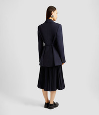 This navy skirt will make a versatile addition to your wardrobe. It is made from navy wool that is sharply pleated for added texture. Wear it with everything from printed blouses to embellished knitwear from the collection. Size and Fit This mid-length skirt has a centre back zip fastening. Fits true to size. Fabric and Care 55% Polyester, 45% Virgin Wool. Dry Clean.