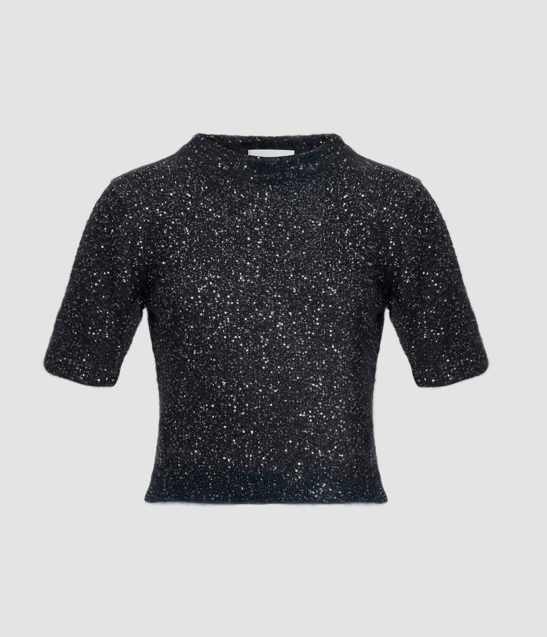 This T-shirt is knitted from a black alpaca-blend and threaded with tiny sequins. It has a close-fitting, cropped silhouette. - Cropped silhouette - Lightweight knit - Crew neckline - Short sleeves - Ribbed trims - Product code: HO26_HO2KT35_30081000 Fits true to size. Fabric and Care 70% Alpaca, 24% Recycled Polyamide, 6% Polyamide. Dry clean.