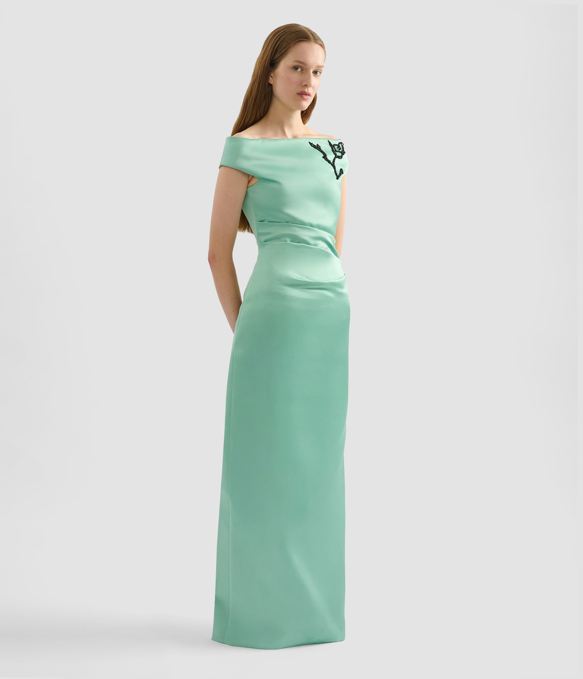 With a Bardot-style neckline, this dress is fitted through the bodice and hips before gently flaring at the knee. It is made from mint duchesse satin and embroidered with a black rose. - Slim silhouette - Fully lined - Floor length - Bardot neckline - Off the shoulder sleeves - Centre back vent - Centre back hook, eye, and concealed zip fastenings - Product code: AW25_G45_50643009 Fits true to size. Fabric and Care 100% Polyester. Lining: 73% Acetate, 27% Silk. Embossing: 50% Glass, 30% Resin, 20% Plastic. Dry clean.