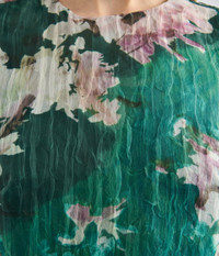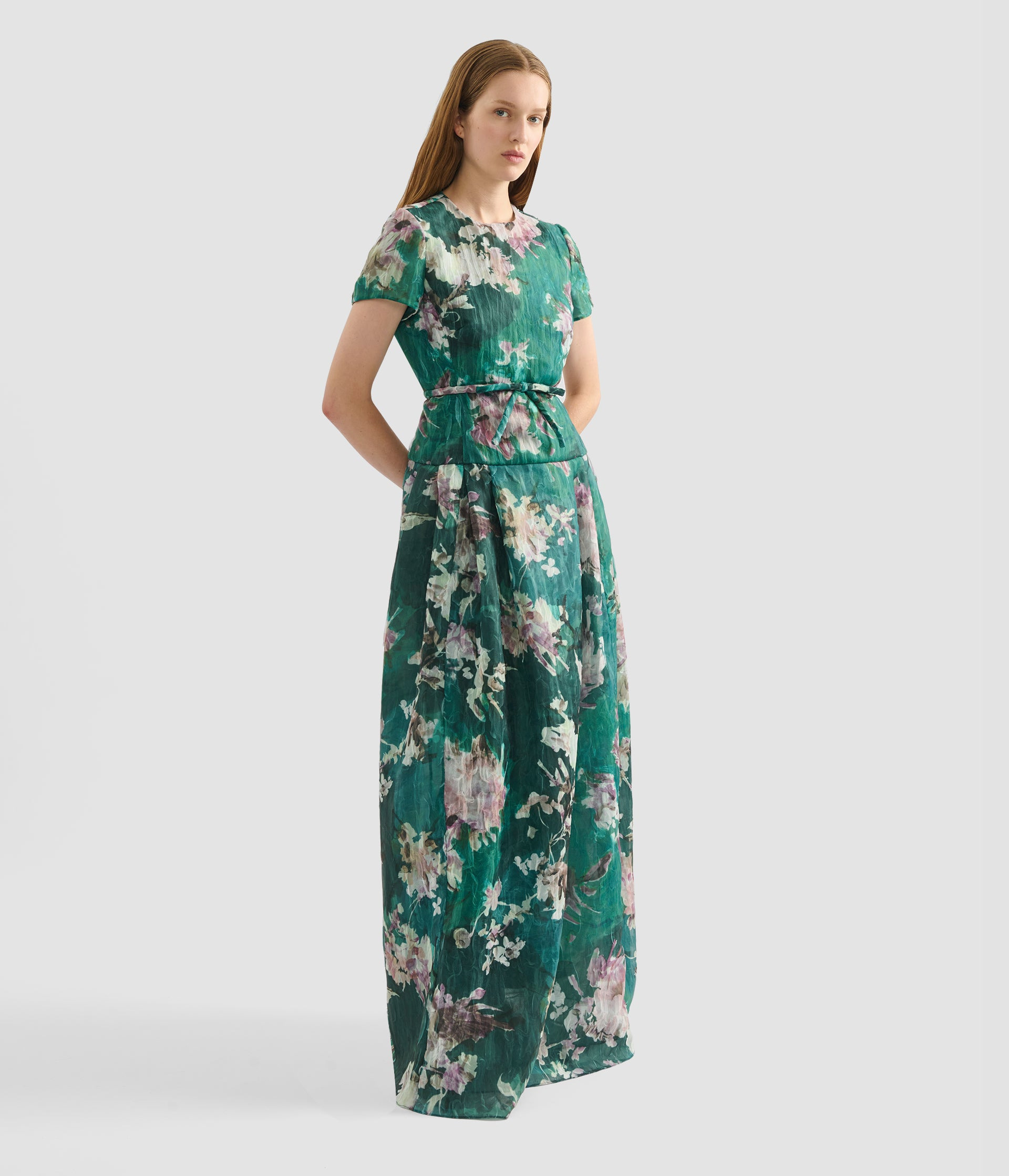 Crafted from sheer crushed organza, this green dress is decorated with painted blooms. It has a bow detail at the waist and a drop waist panel. - Fit and flare silhouette - Fully lined - Floor length - Crew neck - Short sleeves - Centre back hook, eye, and concealed zip fastenings - Product code: AW25_G900_50463007 Fits true to size. Fabric and Care Main: 53% Polyamide, 47% Polyester. Secondary: 100% Silk.