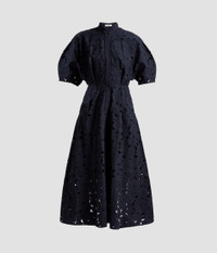 This navy shirt dress is crafted from our floral cutwork cotton, a reinterpretation of a traditional decorative cloth. Shaping a feminine silhouette, it has a stand collar, puffed sleeves, and an A-line skirt. Undo a couple of buttons at the collar for a more relaxed take. Size and Fit This mid-length dress has a button-fastening stand collar, puffed sleeves, a fitted waist, and a flared skirt with hidden side seam pockets. It has concealed centre front button fastenings and is partially lined in navy cotton voile. Fits true to size. Fabric and Care 55% Cotton, 45% Polyester. Lining: 100% Cotton. Dry Clean.
