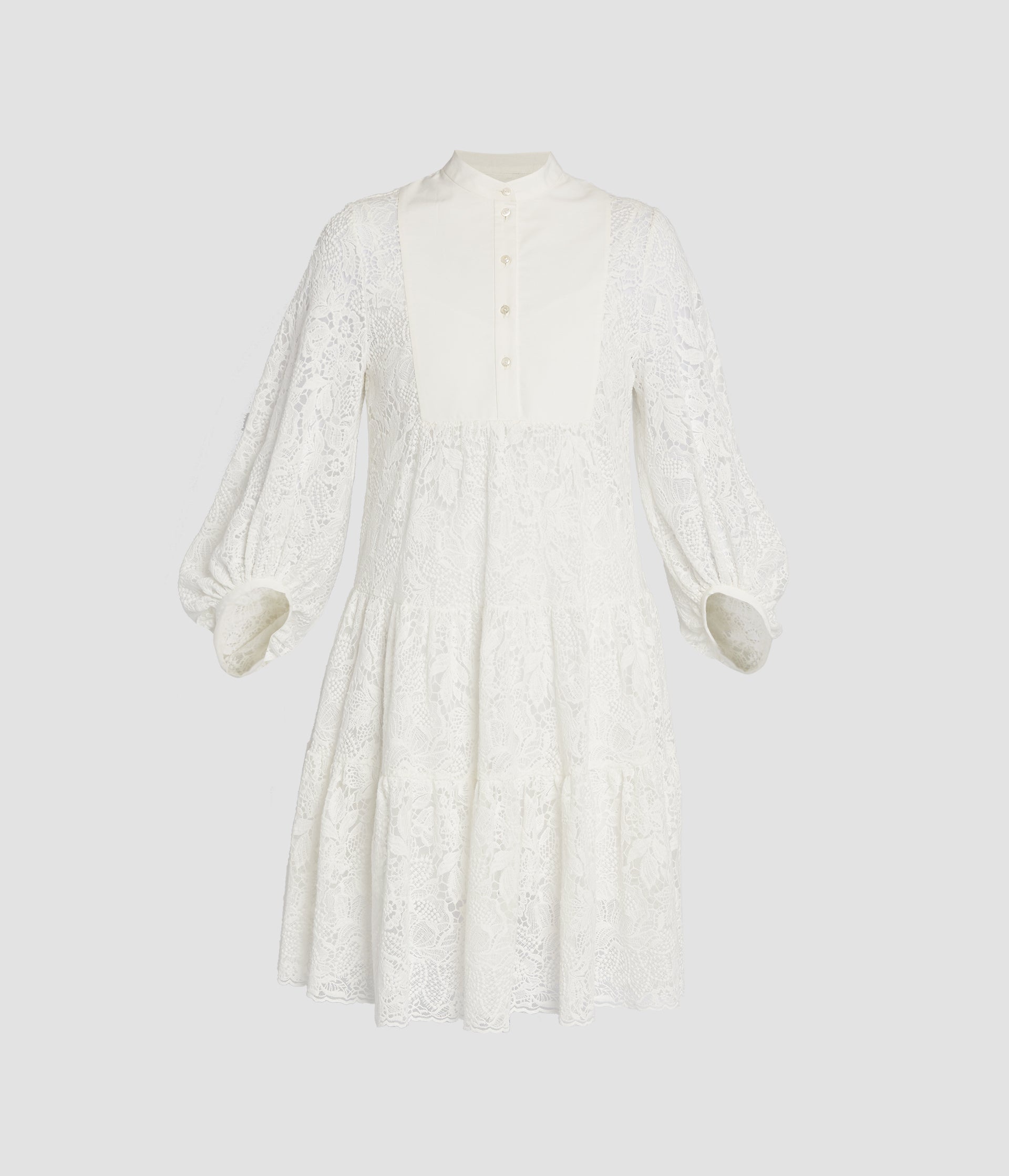 Crafted from ditsy embroidered white cotton, this white dress features a contrasting cotton panel and stand collar. The knee-length silhouette is defined by a stand collar and a tiered skirt. Flared silhouette Comes with slip dress Knee length Stand collar Three quarter-length gathered sleeves Tiered hem Centre front button fastening placket Product Code: VC25_D927_WETFPL Relaxed fit through the body. Recommend sizing down from your usual size for a closer fit. Model is 5'8½ (174cm) and wears size UK 6. Fabric and Care Main: 60% Cotton, 40% Nylon. Secondary: 100% Cotton. Slip: 100% Cotton. Dry clean.