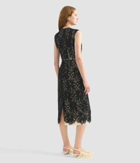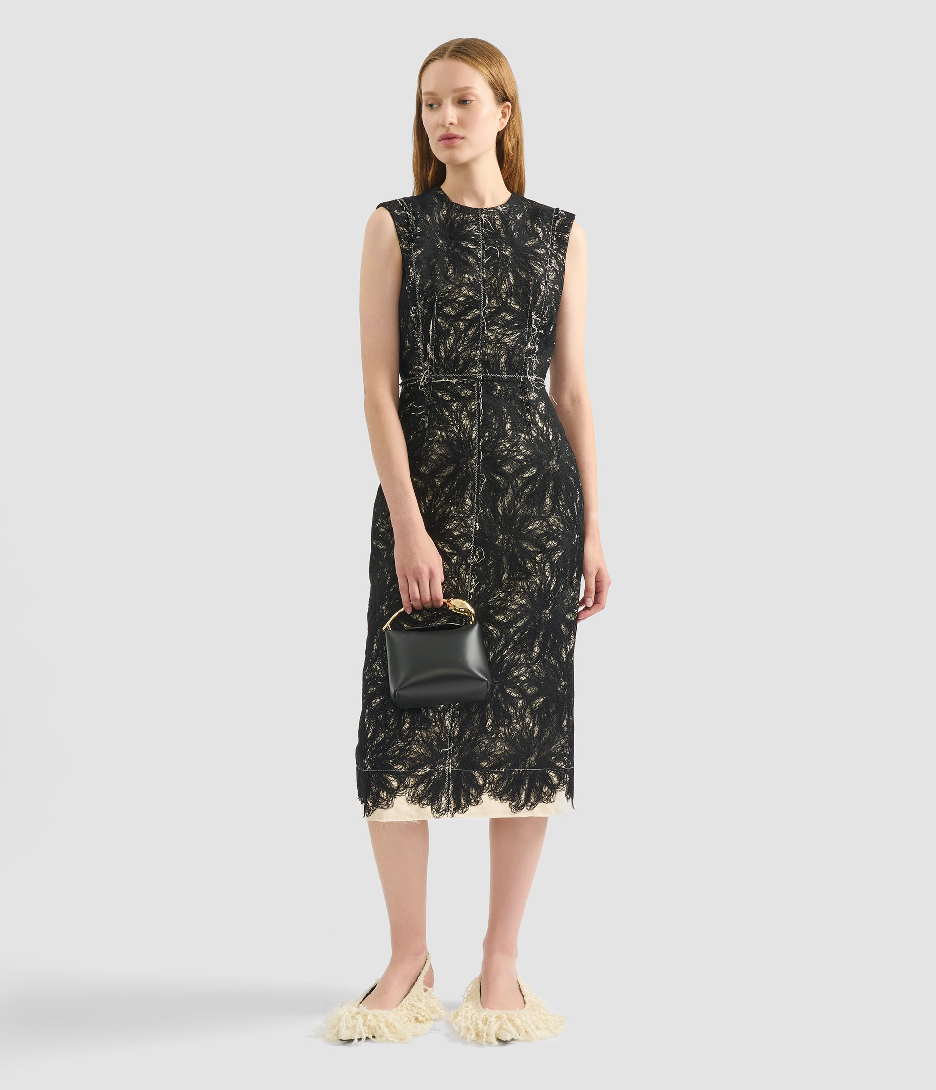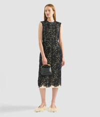 Made from decorative black lace, this pencil dress has a subtle metallic yarn running through it. - Pencil silhouette - Fully lined - Midi length - Crew neck - Sleeveless - Scallop hem - Centre back hook, eye, and concealed zip fastenings - Product code: AW25_D924_50601000 Fits true to size. Fabric and Care 90% Nylon, 10% Metallic Yarn. Secondary: 100% Linen. Lining: 100% Silk. Dry clean.