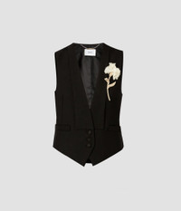 Meticulously tailored from black grain de poudre, this black waistcoat has a deep V-neckline for added drama. It is adorned with an embroidered carnation brooch, a motif seen throughout the PS25 collection and inspired by the one worn by Oscar Wilde. Size and Fit This waistcoat has a deep V-neckline with a lapel collar. It has an adjustable strap at the centre back and button fastenings at the centre front. It is fully lined in ERDEM-branded lining. Fits true to size. Fabric and Care Fabric1: 100% Vrigin Wool. Fabric2: 71% Acrylic, 29% Viscose. Lining: 100% Cupro. Brooch Embroidery: 34% Viscose, 33% Glass, 33% Brass, Pin: 100% Brass. Dry Clean.