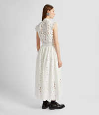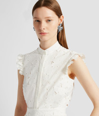 Inspired by a traditional cloth, our cotton cutwork is embroidered with a repeat flower motif. This ivory blouse will make a versatile addition to your wardrobe – easily dress it up or down. It has a flattering stand collar and ruffled trims at the shoulders. Size and Fit This blouse has a stand collar and ruffled trims at the shoulders. It has a concealed button fastening placket at the centre front. Fits true to size. Fabric and Care 55% Cotton 45% Polyester Lining:100% Cotton. Dry Clean.