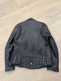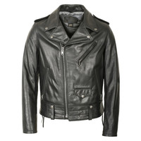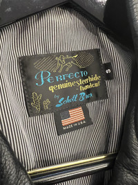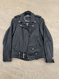 SCHOTT NYC STYLE: 525 Natural Pebble Cowhide Motorcycle Leather Police Jacket in Black New without tags, $865+ tax retail price, 2018-2019. Hit the road in style with a 26” "Chips" California Highway Patrol police motorcycle jacket in buttery-soft, natural pebbled cowhide leather. Laced side gussets, a 2" drop kidney back with belt loops, and a poly-cotton ticking stripe lining. Features essential biker jacket details like an asymmetrical front zip, zippered cuffs, chest pocket and side pockets, shoulder epaulets and coin pocket with snap. Constructed from natural pebbled cowhide and featuring a 27" back length, laced side gussets, drop kidney back, belt loops, several zippered pockets, zippered adjustable sleeves and a non-removable poly-cotton lining. The Perfecto Jacket is made from only the best naturally pebbled cowhides and provides a lifetime of style and protection. Features: Natural pebbled cowhide Side gussets Belt loops Zippered pockets Zippered sleeve cuffs Non-removable poly-cotton lining Made in the USA