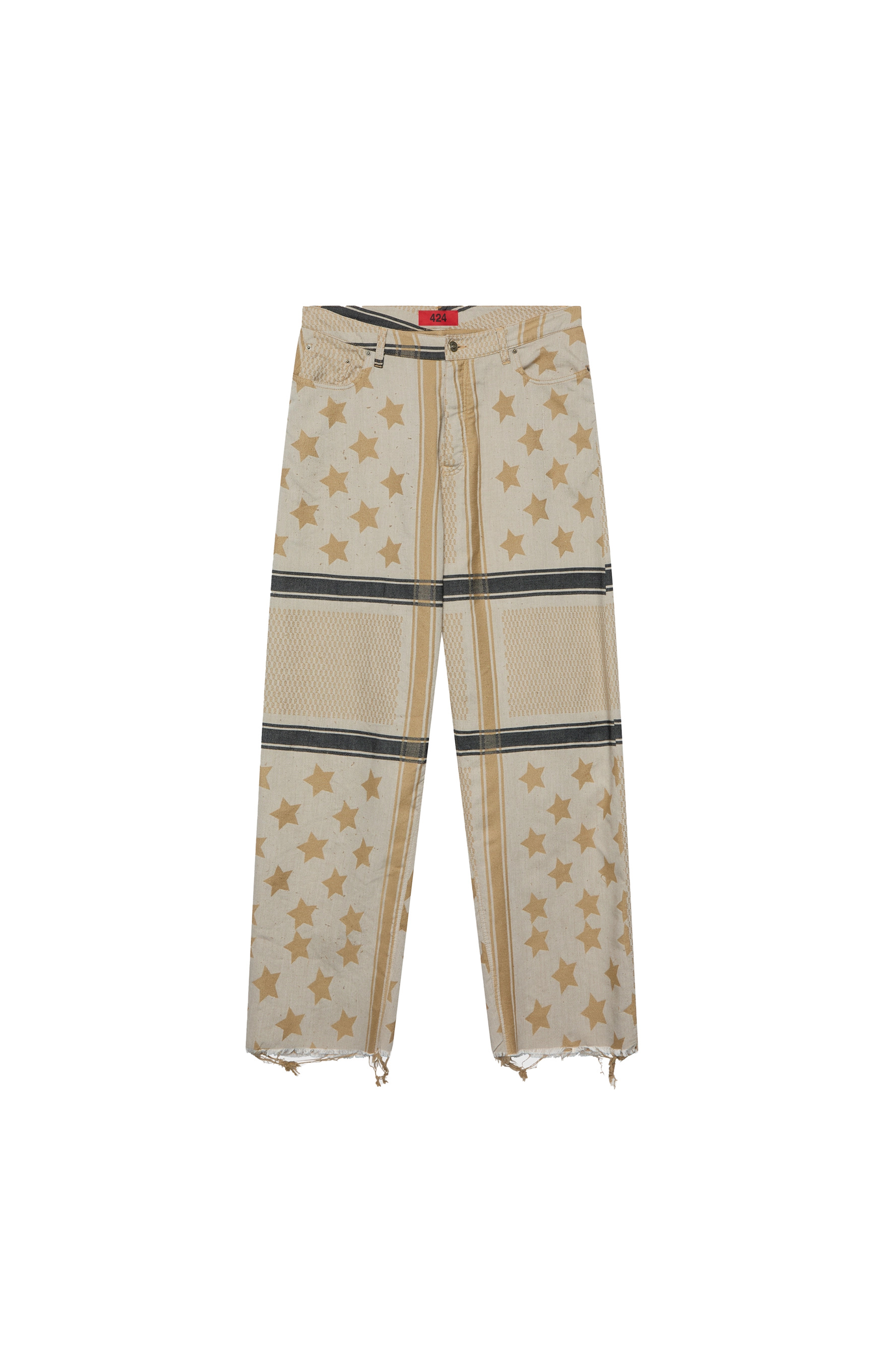 The 424 Big Daddy Pant in a graphic stripe and star knit jacquard fabrication featuring a straight full leg, five-pocket styling, frayed leg openings, and distressed logo patch at rear. DETAILS - Lightweight - Knit jacquard fabrication - Pattern throughout - Straight full leg - Five-pocket styling - Frayed leg openings - Logo patch at rear Sizing: - True to size Material: 64% Cotton / 36% Polyester Made in Italy Product codes: - SKU: ESSX/424/SS25/FF5SMT16BPTF075BLU/Multi/50 - UPC: 645707828627
