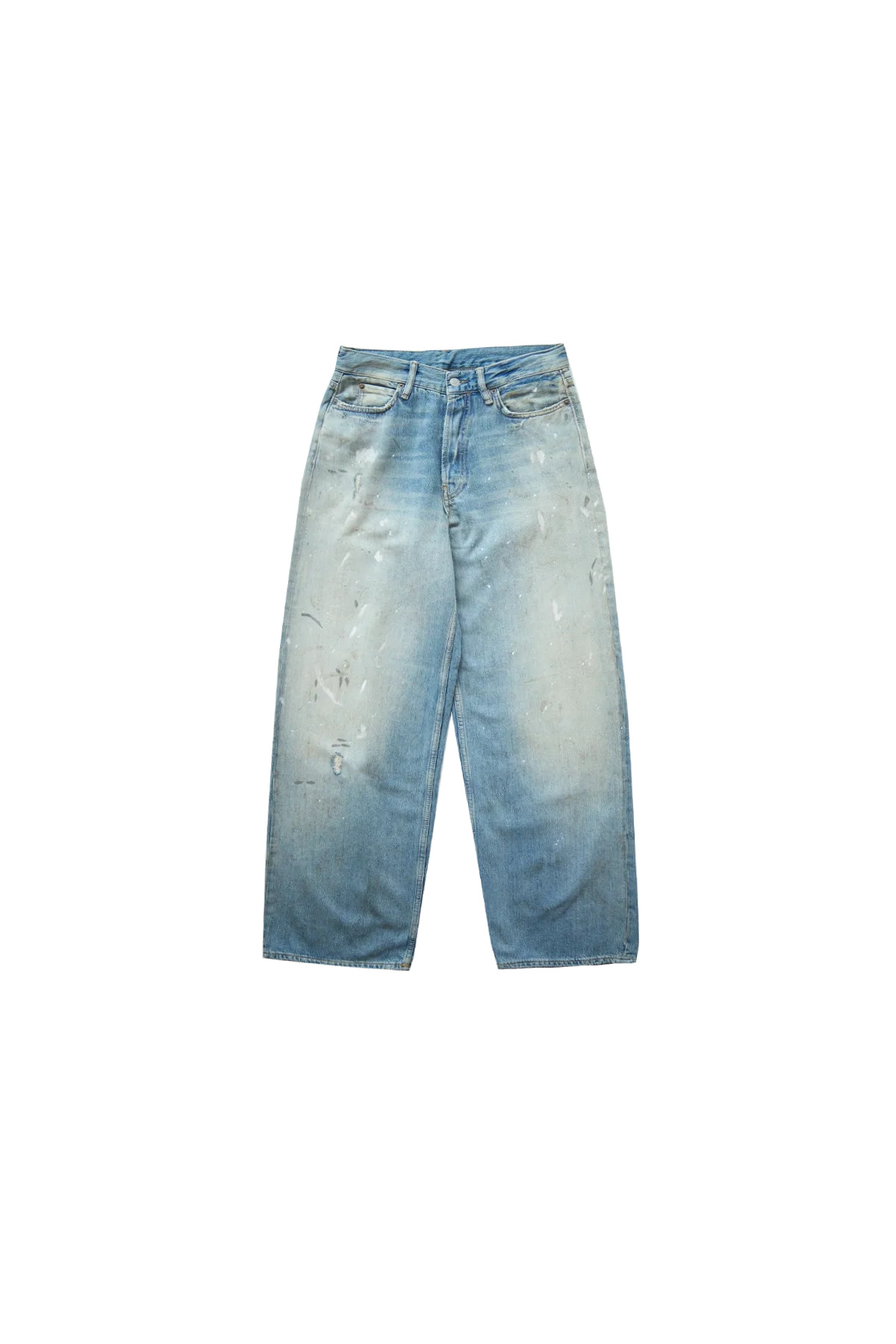 The Acne Studios 1981 Trafalgar Jeans in non-stretch denim featuring fading, distressing, and smudging throughout, a wide-leg, mid-rise, five-pocket styling, and leather logo patch at the back waistband. DETAILS - Non-stretch denim jeans - Faded/distressed/smudged - Wide-leg - Mid-rise - Belt loops - Five-pocket styling - Button fly - Leather logo patch at back waist - Logo-engraved silver-tone hardware Sizing: - True to size Material: 100% Cotton Made in Italy Product codes: - SKU: ESSX/ACE/AW25/C00096228/Blue/S - UPC: 7323336824342
