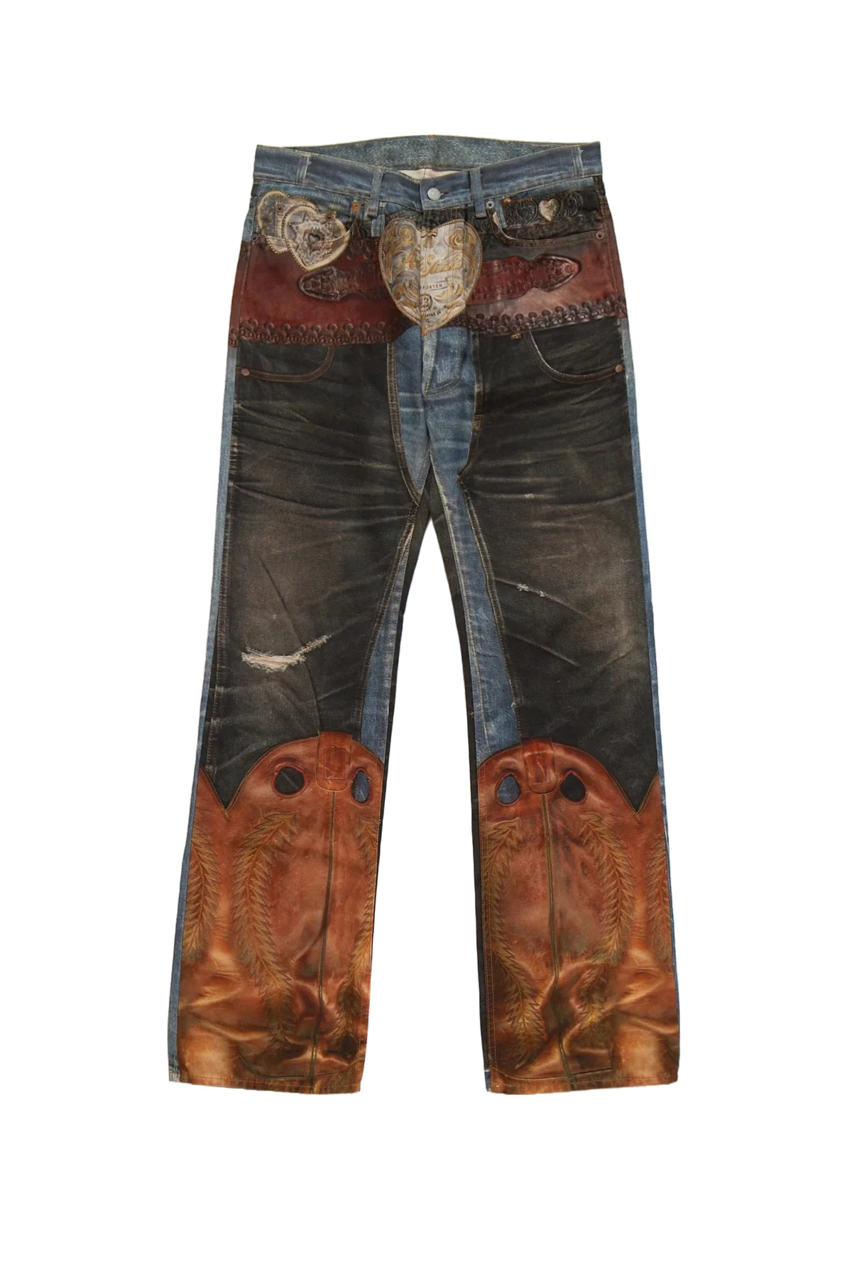 The Acne Studios 2010M Heart Buckles Trompe L'Oeil Jeans in cotton canvas cut to a regular fit with a low waist, straight leg, five-pocket styling, and seasonal trompe-l’oeil print featuring a branded heart-shaped buckle, logo, chaps, and cowboy boots. Model is 5'10 and wears size medium DETAILS - Canvas fabrication - 5-pocket denim - Regular fit - Low waist - Straight leg - Seasonal all-over trompe-l’oeil print - Button fly - Belt loops Sizing: - True to size Material: Organically Grown Cotton Made in Italy Product codes: - SKU: ESSX/ACE/AW25/BK0704AIL/Blue/S - UPC: 7323336804054