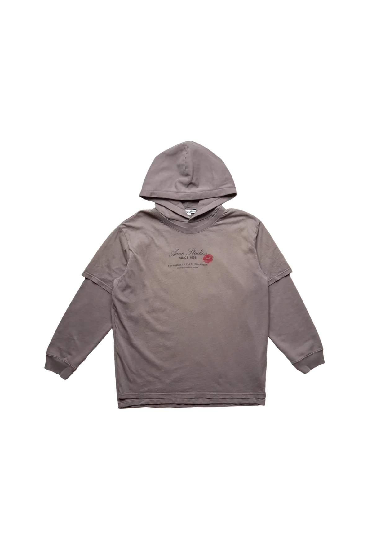 The Acne Studios Business Card Layered Hoodie in garment-dyed organic jersey and French terry with fading throughout, layered construction, a crewneck, and logo and graphic print at chest. DETAILS - Garment-dyed - Organic jersey + French terry - Fading throughout - Layered construction - Rib-knit crewneck + cuffs - Logo + graphic printed at chest Sizing: - True to size Material: 100% Organic Cotton Made in Portugal Product codes: - SKU: ESSX/ACE/SS25/AI0160902/gray/XS - UPC: 7323336719471