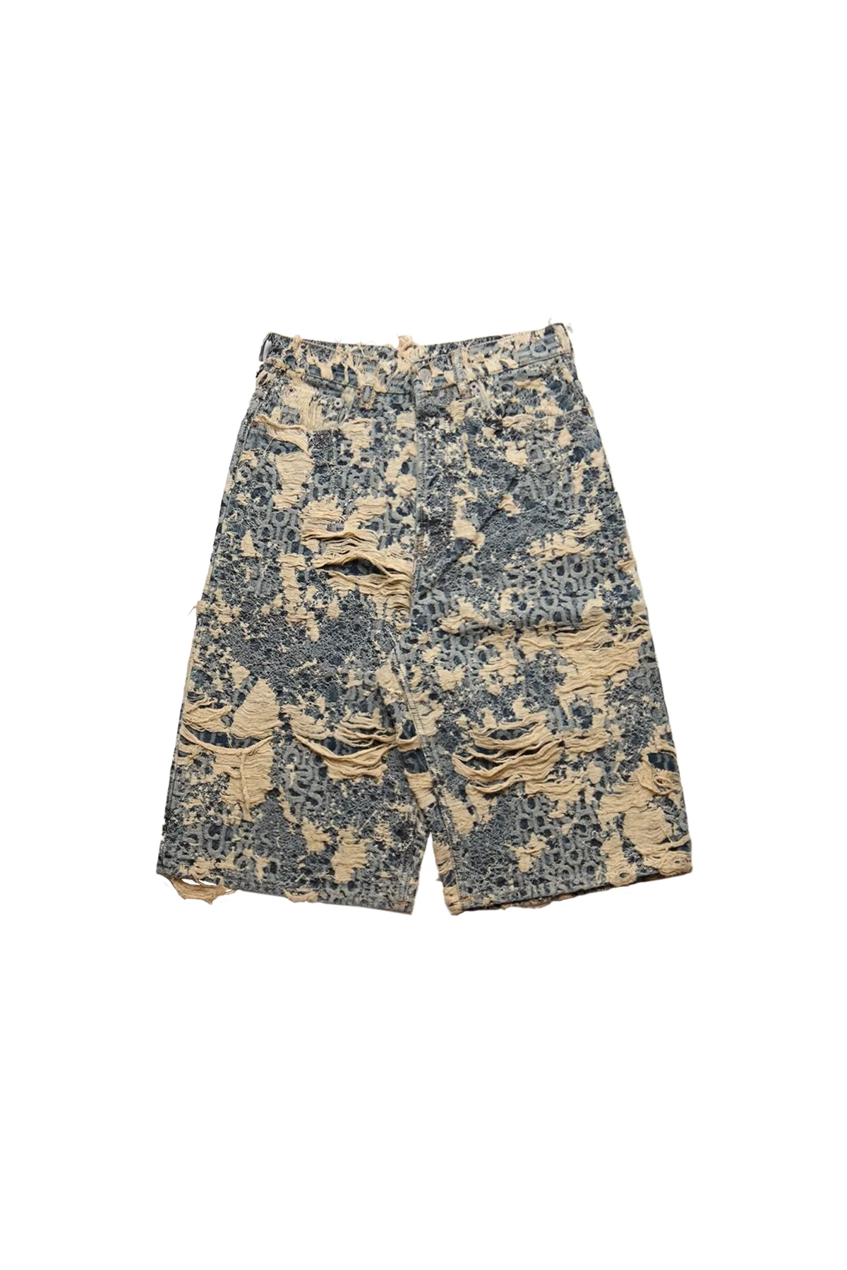 The Acne Studios Distressed Monogram Denim Shorts featuring a fil de coupe distressed Acne Studios jacquard monogram and distressed coated treatment, loose fit with a low waist and below knee length with five-pocket styling and leather logo patch at back waistband. DETAILS - Non-stretch denim - Fil de coupe distressed jacquard - Coated treatment - Loose fit - Low waist - Below knee length - Dropped crotch - Five-pocket styling - Button Fly - Belt loops - Logo patch at back Sizing: - True to size Material: Organic Cotton Made in Italy Product codes: - SKU: ESSX/ACE/AW25/BE0197863/Blue/44 - UPC: 7323336743995