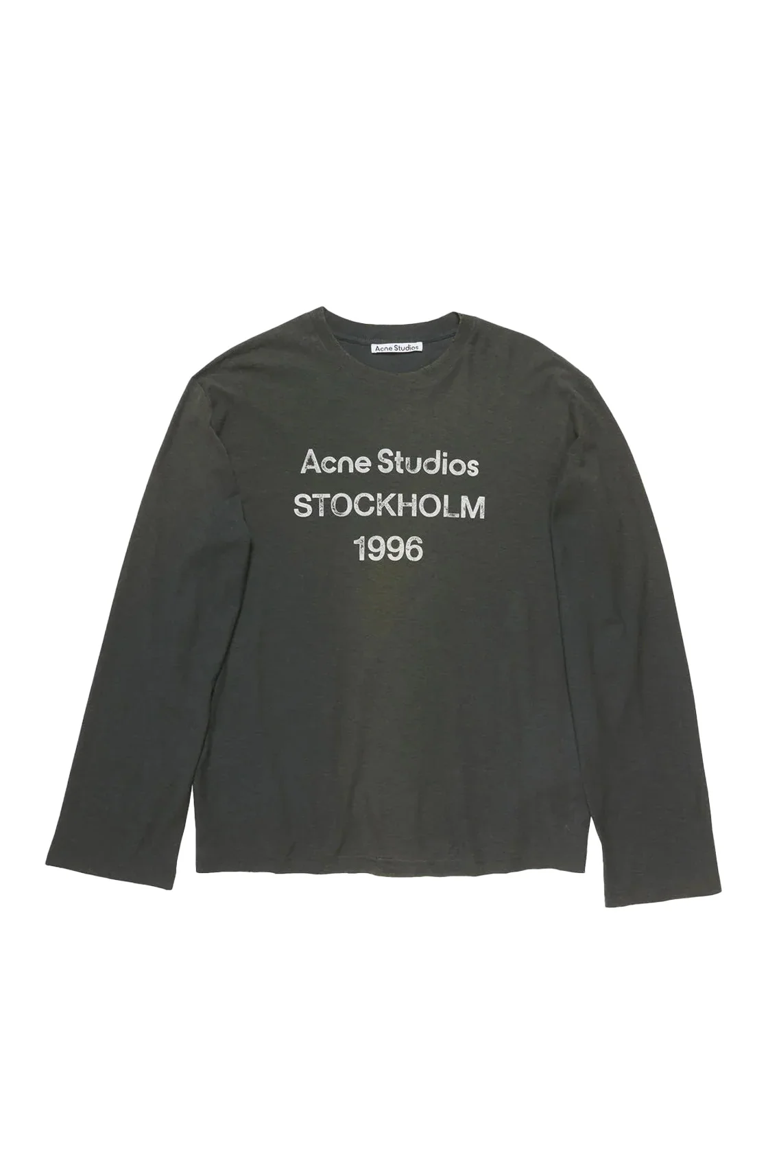 Acne Studios Logo Long Sleeve T-Shirt Faded Black is cut to a relaxed unisex fit and hip length. Detailed with an Acne Studios 1996 stamp logo, distressed neckline, cuffs and hem. Crafted from cotton with a sprayed finish. Unisex, relaxed fit. DETAILS Relaxed unisex fit Hip length Crew neck Sprayed finish Stamp logo 'Acne Studios Stockholm 1996' - Distressed neckline, cuffs and hem Material: 85% Cotton 15% True Hemp Product codes: - SKU: ESSX/ACE/SS26/CL0197BM0/Black/S - UPC: 1403558072922