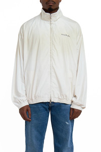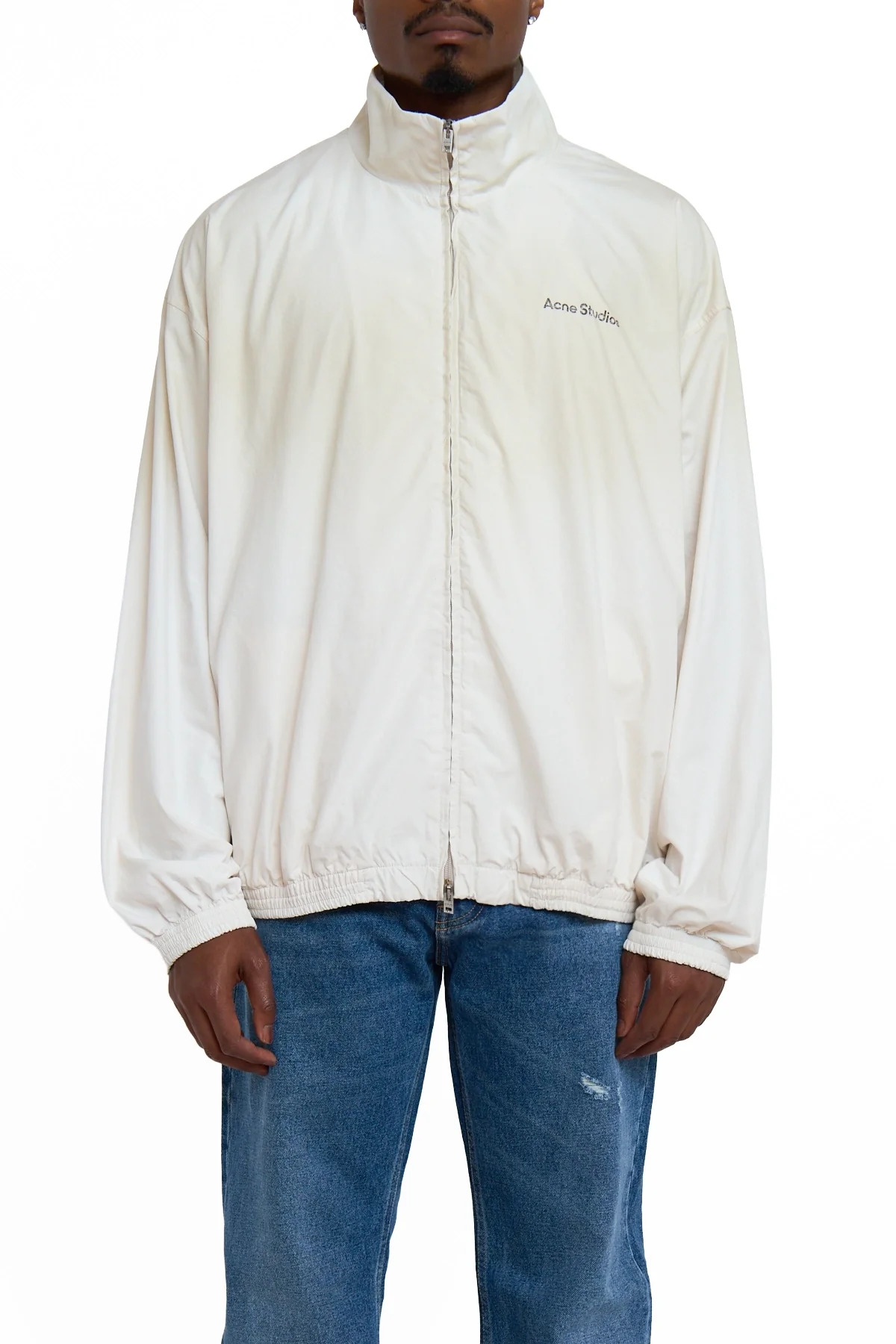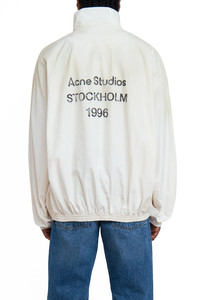 The Acne Studios Logo Zipper Jacket is a lightweight unisex smudged effect poplin jacket with a relaxed, hip-length oversized fit featuring a contrast Acne Studios 1996 stamp logo at the front and across the back, two-way front-zip centre zip closure, side seam pockets, and elasticated cuffs and hem. Lined. Model is 5'10 and wears size 50 DETAILS - Unisex - Relaxed fit - Hip length - Zipper front closure - Side seam pockets - Elasticated cuffs + hem - Acne Studios stamp logo at back - Fully lined Sizing: - True to size Material: Organically Grown Cotton Lining: 82% Nylon / 18% Elastane Made in Portugal Product codes: - SKU: ESSX/ACE/AW25/B90863DC6/White/46 - UPC: 7323336817825