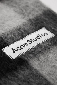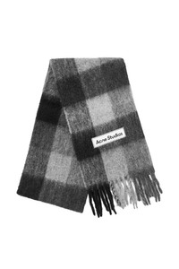 Acne Studios signature rectangular brushed jacquard check pattern scarf with front logo patch and fringed ends. DETAILS Material: 33% Alpaca 25% Wool 22% Nylon 20% Mohair L: 86" x W: 11" Made in Italy Product codes: - SKU: ESSX/ACE/AW25/CA0084DUC/Black/OS - UPC: 7323336762064