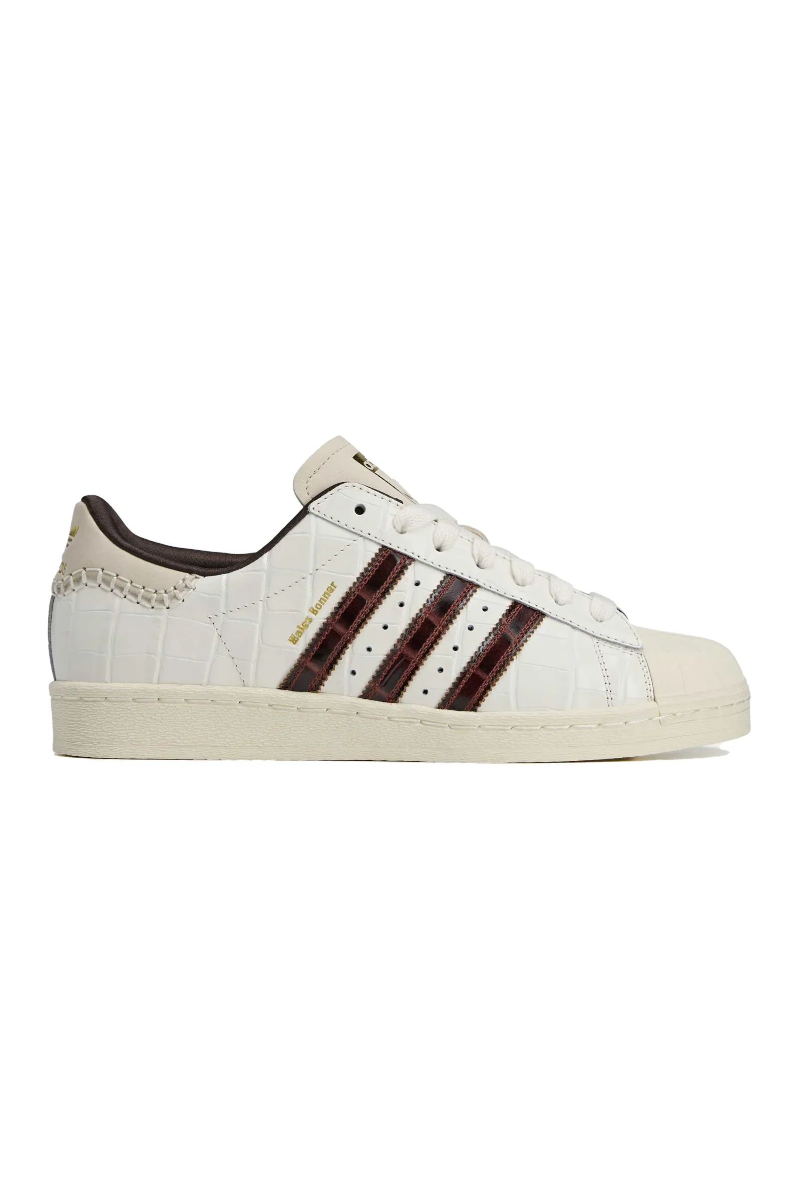 Adidas X Wales Bonner Superstar gets an elevated treatment with carefully considered design elements. A subtle crocodile-printed upper provides textural interest while maintaining understated elegance. Dark brown stripes create visual contrast against the base, while precision stitching details enhance the overall craftsmanship. The interior features a soft satin lining for added comfort and refinement. Men's UK Sizing. DETAILS Gold Foil Branding Material: Rubber Sole 100% Leather Upper Product codes: - SKU: ESSX/WAL/AW25/KH8797/White/5.5 - UPC: 198323510129