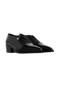 The McQueen Lace Up Derby With Skull in polished calfskin featuring a pointed toe, leather laces, a high vamp with an attached silvertone skull charm, and a stacked leather heel and midsole. Heel: H1.75" DETAILS - Polished calfskin derbys - Pointed toe - Leather lace-up closure - High vamp - Silvertone skull charm at side - Buffed leather lining - Stacked leather heel + midsole - Polished leather sole with rubber injection - Heel: H1.75" Sizing: - True to size Material: Calfskin Sole: Leather / Rubber Made in Italy Product codes: - SKU: ESSX/MCQ/AW25/852393WHAEZ1000/Black/41 - UPC: 196403287640