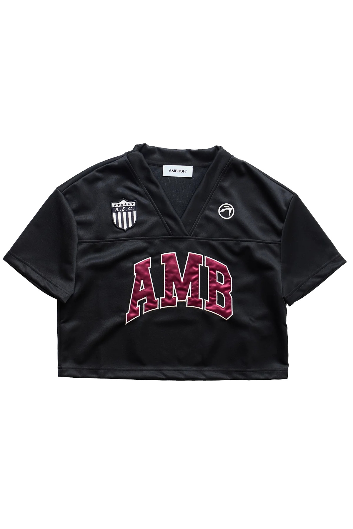 Ambush 34 crop t-shirt featuring varsity-inspired graphics, v-neckline, and 'AMB' logo lettering. This item is final sale and is not eligible for return or exchange. DETAILS - Cropped short sleeve t-shirt - Varsity style logo at front - V-neck style - Made in Italy Material: 100% Polyester Product codes: - SKU: ESSX/BWBD002F24JER0011028/black/S - UPC: 1403558016544