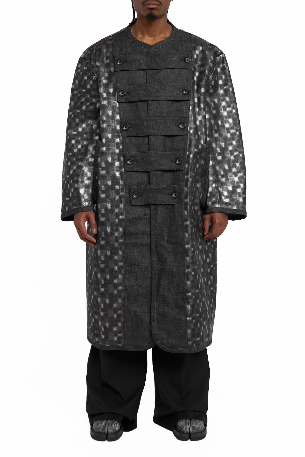The CDG Homme Plus Denim Mixed Fabric Coat in lightweight coated denim with a digital print featuring an oversized silhouette, buttoned tab closures at the front, cut-out concealed pocket detailing, and an accentuated 14" back slit. Unlined. 51" long. Model is 5'10 and wears size medium DETAILS - Coated denim - Digital print - Cut-out pocket detail - Tab front closures - Back slit Sizing: - True to size Material: Cotton Made in Japan Product codes: - SKU: ESSX/CHP/AW25/PPC007051/Blue/M - UPC: 3607936603304