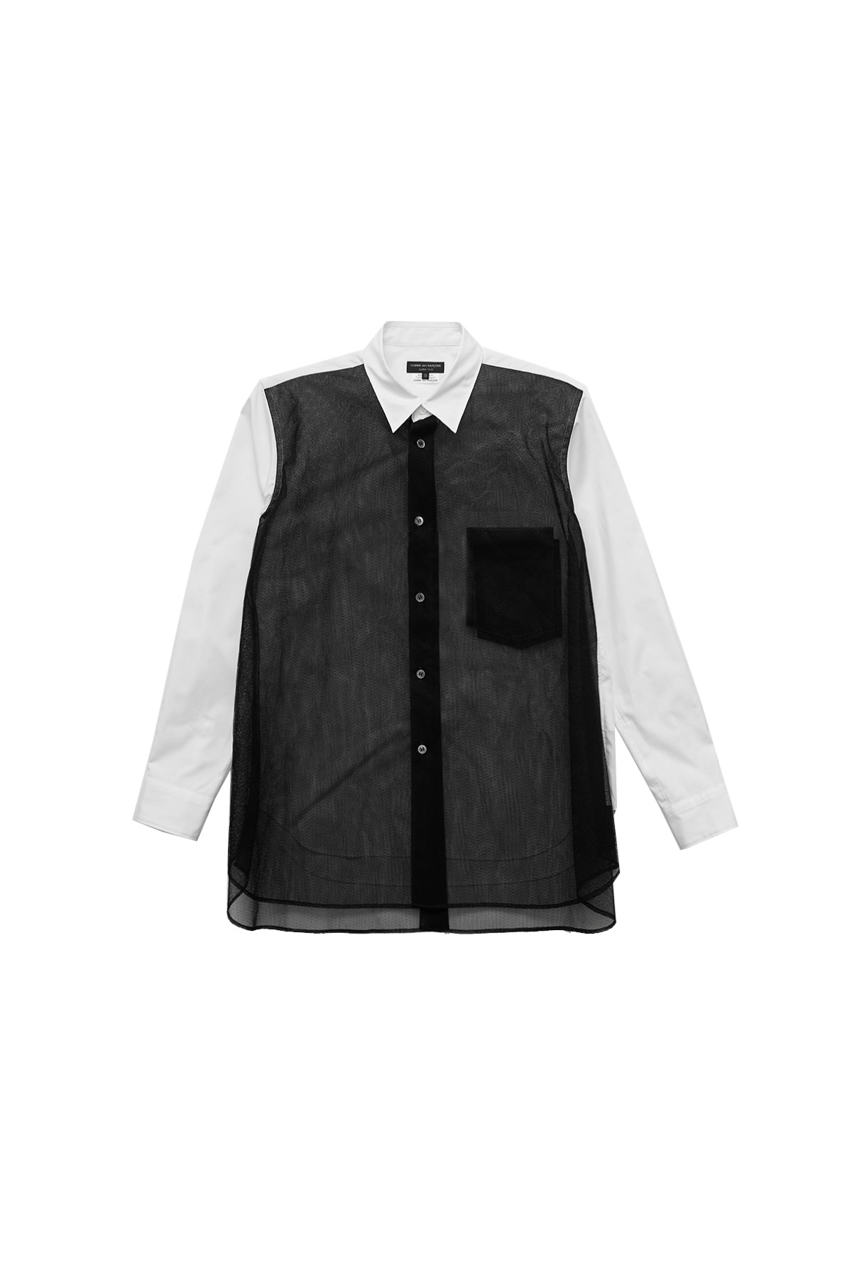 The Comme Des Garcons Homme Plus Tulle Layered Shirt featuring a classic poplin button down base layer with a spread collar, single-button barrel cuffs, and chest patch pocket, juxtaposed with a contrasting dual layer button-front tulle face with buttons and patch pocket for alternate styling. DETAILS - Unisex - Lightweight - Layered construction - Spread collar - Button closure - Patch pockets at chest - Shirttail hem - Single-button barrel cuffs - Twin pleats at back yoke - Mother-of-pearl hardware Sizing: - True to size Material: Base Layer: Cotton Outer Layers: 100% Nylon Made in Japan Product codes: - SKU: ESSX/CHP/SS25/POB0090511/White/XS - UPC: 3607936267483