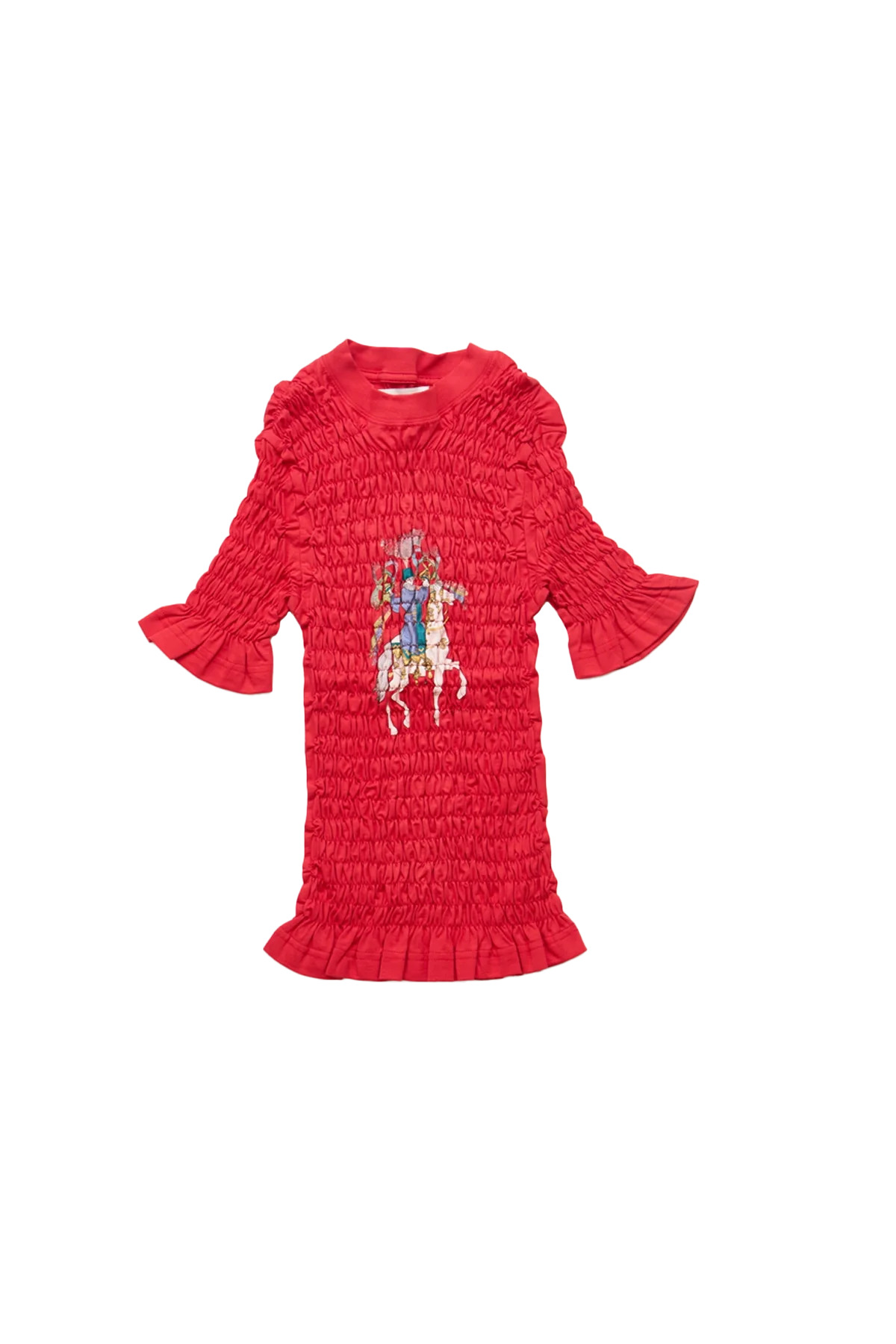 The Conner Ives Red Camelot Shirred T-Shirt featuring an all-over shirred treatment that lends the piece stretch, and a logo print at the front. Designed with a fitted silhouette, we suggest taking one size up. DETAILS - Lightweight - Slim-fit - Stretch composition - Shirred throughout - Graphic at front Material: Poly-Blend Made in Portugal Product codes: - SKU: ESSX/CON/SS25/2002/red/XS - UPC: 5056792505341
