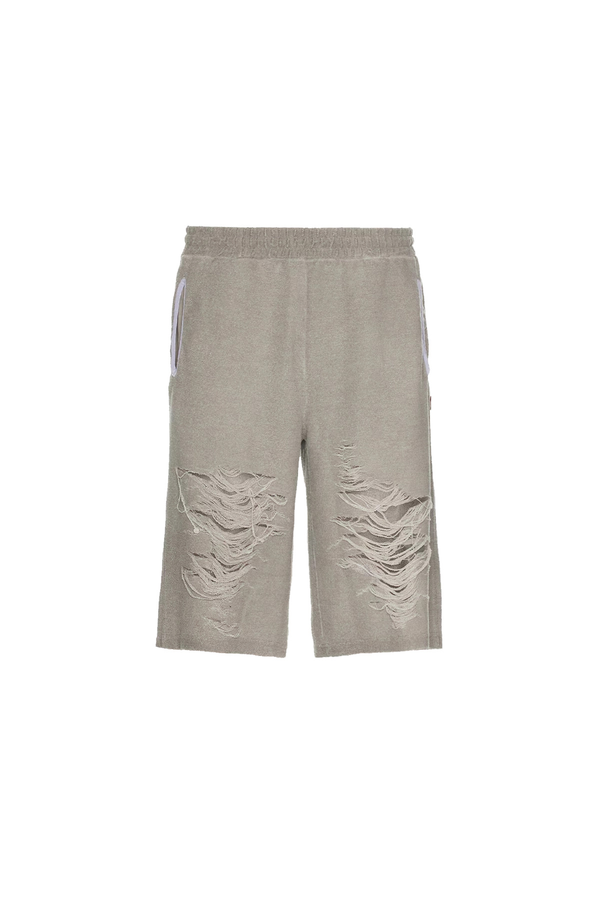 The Diesel Distressed Shorts in grey jersey are relaxed-fit shorts with a tulle-like lining exposed by distressed detailing throughout, including frayed edges and subtle abrasions, an elasticated drawstring waist, side pockets, and back patch pocket. Approx 26" in length. DETAILS - Midweight jersey - Soft handfeel - Distressed throughout - Side pockets - Single pocket at rear Sizing: - True to size Material: 64% Cotton / 34% Polyester / 2% Elastane Made in Bulgaria Product codes: - SKU: ESSX/DIE/SS25/A191160PLAI97C/Gray/S - UPC: 8055055986818