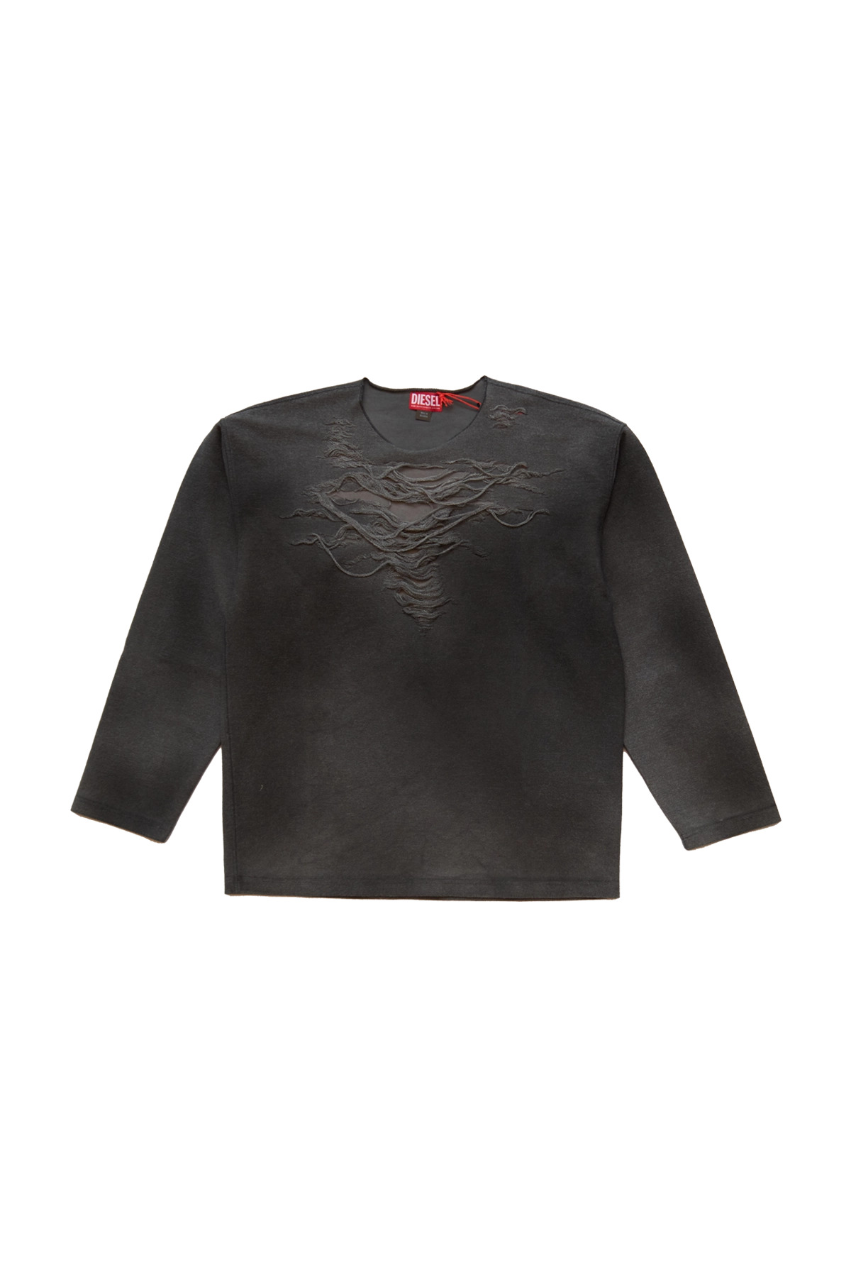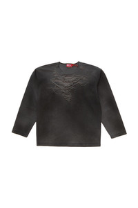 The Diesel Distressed Sweatshirt in an overdyed fabrication features a relaxed fit, crewneck, dropped shoulders, and a burn-out effect at the neckline to reveal a layer of clear tulle beneath, creating hanging fringes. DETAILS - Overdyed effect - Distressed detailing at front - Tulle lining - Crewneck - Dropped shoulders Sizing: - True to size Material: 66%Cotton / 34% Polyester Made in Bulgaria Product codes: - SKU: ESSX/DIE/SS25/A182160PLAI9AW/Gray/S - UPC: 8055055972392